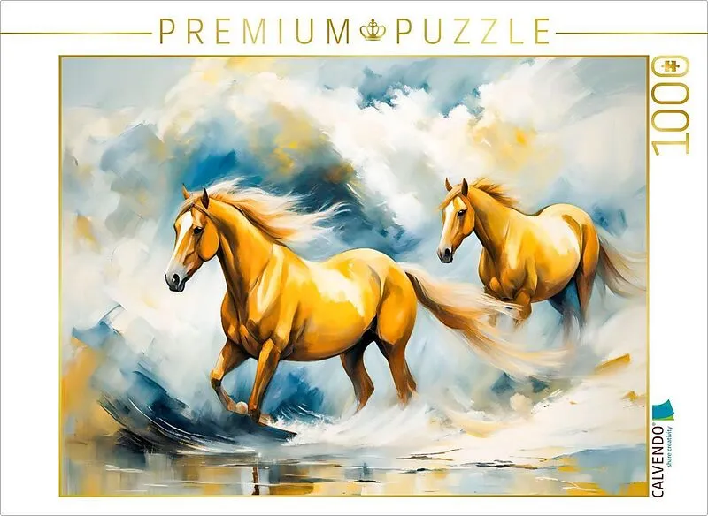 Dieses beeindruckende Motiv aus dem Kalender "Jahr des Pferdes - Der unbezähmbare Geist der Pferde" zeigt zwei braune Pferde, die durch die Wellen am Strand galoppieren, im Stil des Realismus. Perfekt für Leinwanddrucke, Puzzle und elegante Dekoratio...