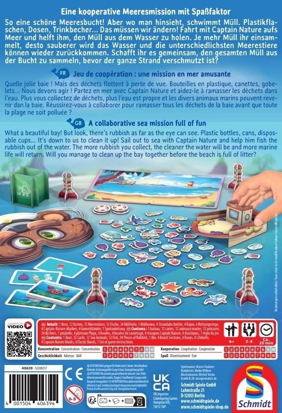 Ihr spielt gemeinsam, fahrt mit Captain Nature aufs Meer und versucht, den Müll aus demWasser zu holen. Schafft ihr das, bevor der Strand vollständig verschmutzt ist, habt ihr gewonnen. Aber ganz einfach ist das nicht, denn ihr seht nicht, wo ihr hinfahrt und ...