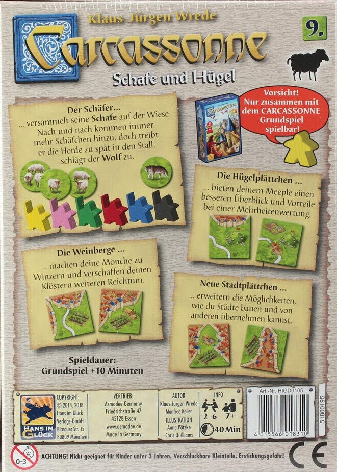 In der 9. Erweiterung Schafe und Hügel für Carcassonne dem Spiel des Jahres 2001 legen die Spieler ihr Augenmerk auf die saftigen Wiesen rund um Carcassonne. Wer seinen Schäfer auf die richtige Wiese schickt, kann in aller Ruhe warten, bis sich Schaf um Schaf ...