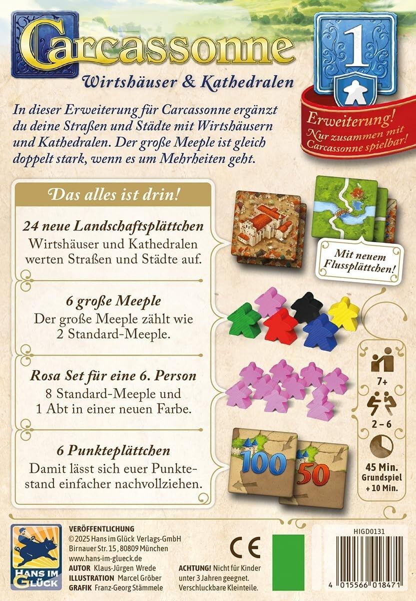 Carcassonne Erweiterung 1: Wirtshäuser & Kathedralen Die 1. Erweiterung für Carcassonne erweitert das beliebte Familienspiel um neue taktische Elemente und zusätzliche Spielmöglichkeiten. Mit Wirtshäusern und Kathedralen lassen sich Straßen und Städte gewinnb...