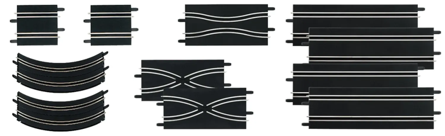 Großes Ausbauset zur Erweiterung von CARRERA GO!!! Bahnen. Das Set besteht aus 4 Geraden 342 mm, 2 Spurwechseln, 1 Engstelle, 2 Fly Over und 2 Geraden 114 mm.