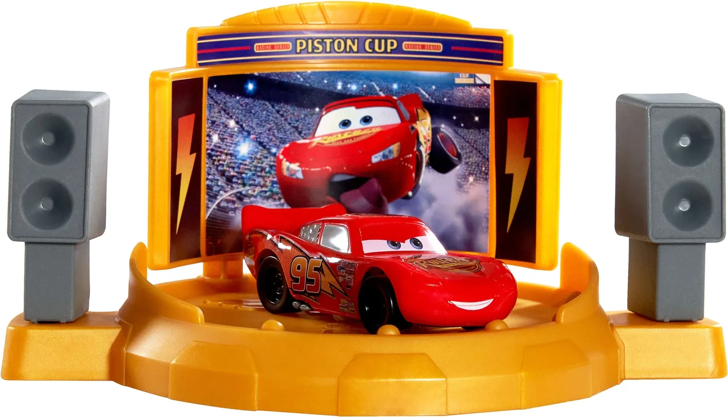 2 Spielmöglichkeiten: Das Lightning McQueen Spielzeugauto in den Starter fahren und losrasen lassen, vorbei an der Zielflagge und zusehen, wie es umherwirbelt! Oder die Rampe in der Mitte der Rennstrecke anheben, um seine Stuntkünste zu testen.