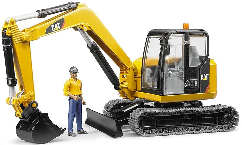 Bruder 02466 Cat Minibagger mit Bauarbeiter Der Cat Minibagger ist nicht wirklich mini, sondern eine echte Größe in seiner Klasse. Durch seine kompakten Aufbauabmessungen ist er auch auf engem Terrain Zuhause. Der zusätzlich seitlich schwenkbare Baggerarm mach...