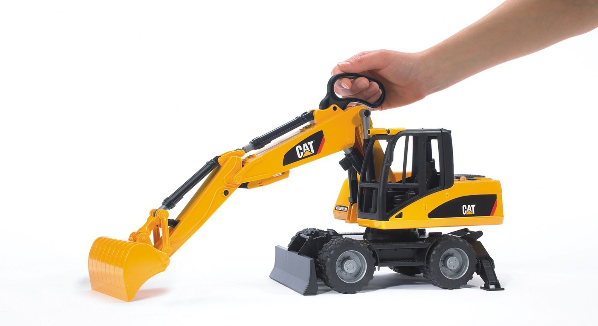 Bruder 02445 CAT Mobilbagger Brudertypisch lässt sich mit dem Mobilbagger die Realität nachspielen, die 2 Stützfüsse stabilisieren den Bagger und ermöglichen ein sicheres Arbeiten. Die Knicklenkung am Baggerarm ermöglicht ein Arbeiten auf engem Raum und bietet...