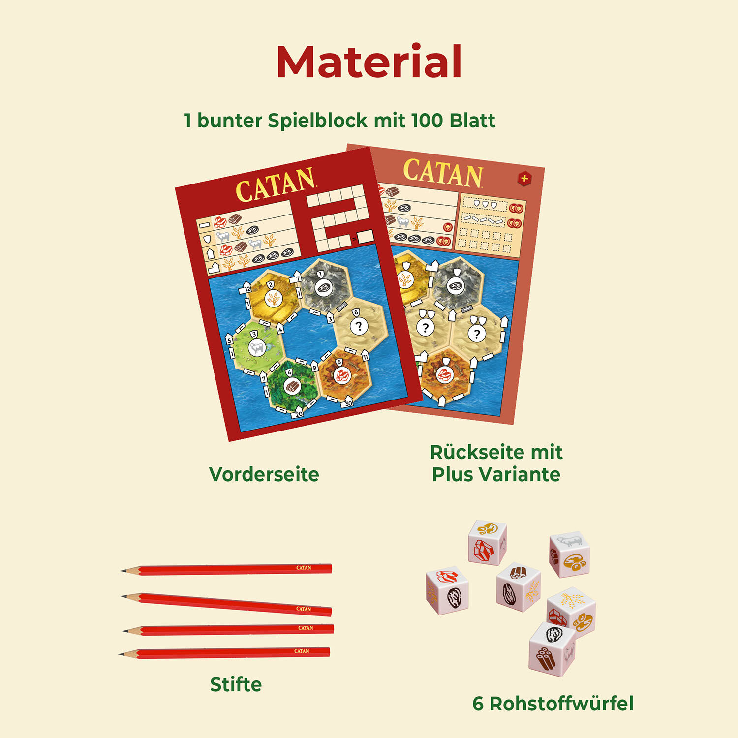 CATAN als Würfelspiel: Hier wird Wurf um Wurf die eigene Insel gebaut.Zwei abwechslungsreiche Spielvarianten auf einem farbigen Spielblock bieten taktische Herausforderungen.Vier Bleistifte mit CATAN-Prägung und hochwertig geprägte Würfel mit neuen Symbolen so...