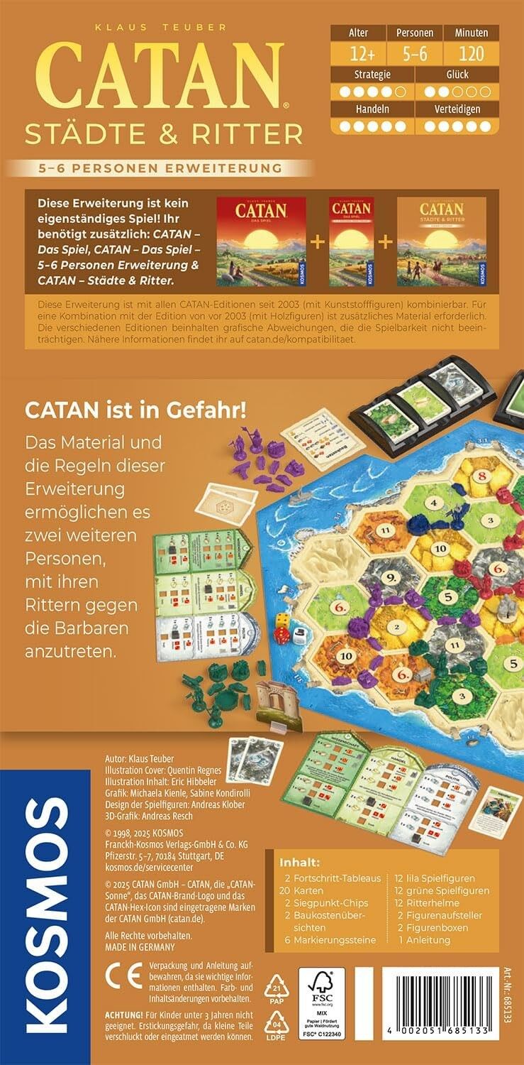 Bitte beachten: Diese Erweiterung ist kein eigenständiges Spiel! Ihr benötigt zusätzlich: CATAN-Das Spiel, CATAN-Das Spiel die 5-6 Personen Erweiterung & CATAN-Städte und Ritter. Die Erweiterung zur CATAN Erweiterung Städte & Ritter für 5 bis 6 Spielerinnen un...