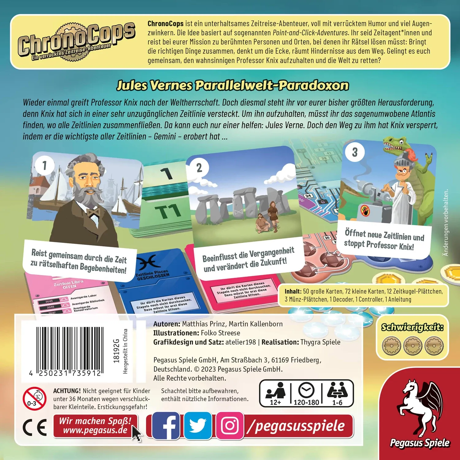 ChronoCops ist ein Zeitreise-Abenteuer voll mit verrücktem Humor und viel Augenzwinkern. Der verrückte Professor Knix hat sich in einer unzugänglichen Zeitlinie versteckt. Um ihn aufzuhalten, müssen die Spielenden Atlantis finden.