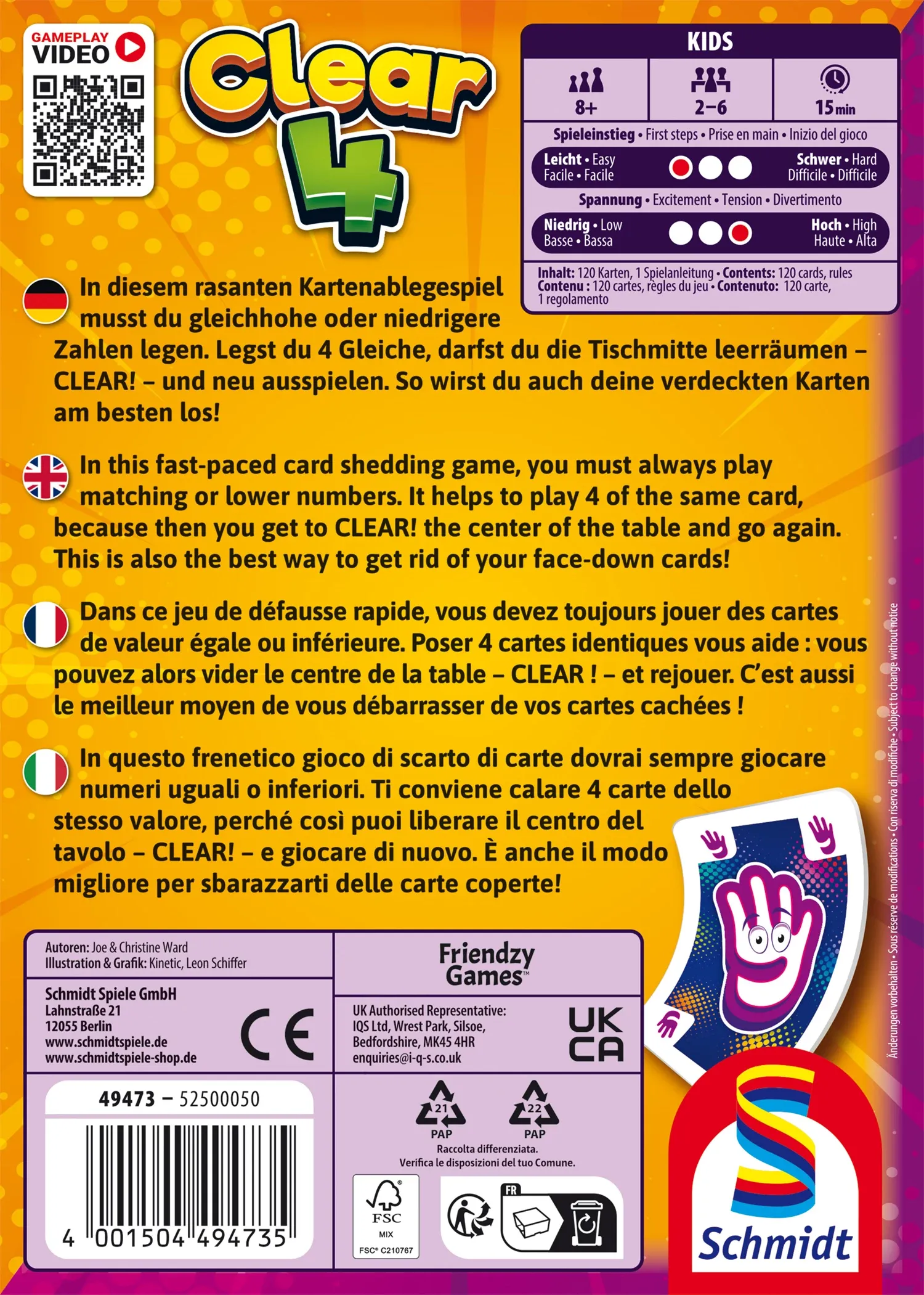 In diesem rasanten Kartenablegespiel musst du gleichhohe oder niedrigere Zahlen legen. Legst du 4 Gleiche, darfst du die Tischmitte leeräumen CLEAR! und neu ausspielen. So wirst du auch deine verdeckten Karten bestens los!34 Kunden haben diesen Artikel kürzlich gekauft.