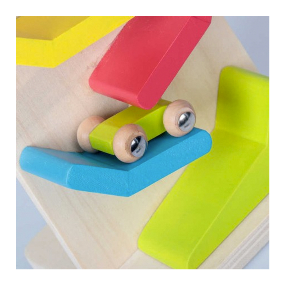Beobachte, wie die Autos über die Strecke flitzen. Setze das Auto auf die Rampe, es saust die ganze Wand herunter. Beim Flippen kommt das 'Klick-Klack' Geräusch. Fördert die Feinmotorik und regt die Phantasie an. Inhalt: Rampenwand aus Holz, 3 Autos ...