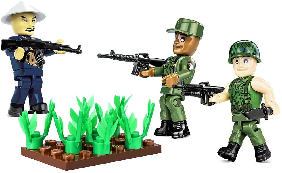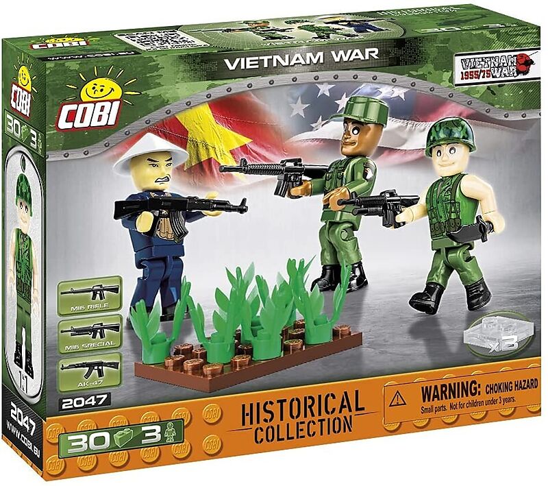 Ein Set aus drei Figuren, die Soldaten darstellen, die während des Konflikts auf der Halbinsel Indochina kämpfen. Jede Figur repräsentiert ein Mitglied einer anderen Einheit. Der Vietcong-Soldat erhielt einen Aufdruck mit einer typischen Uniform und wurde mit ...