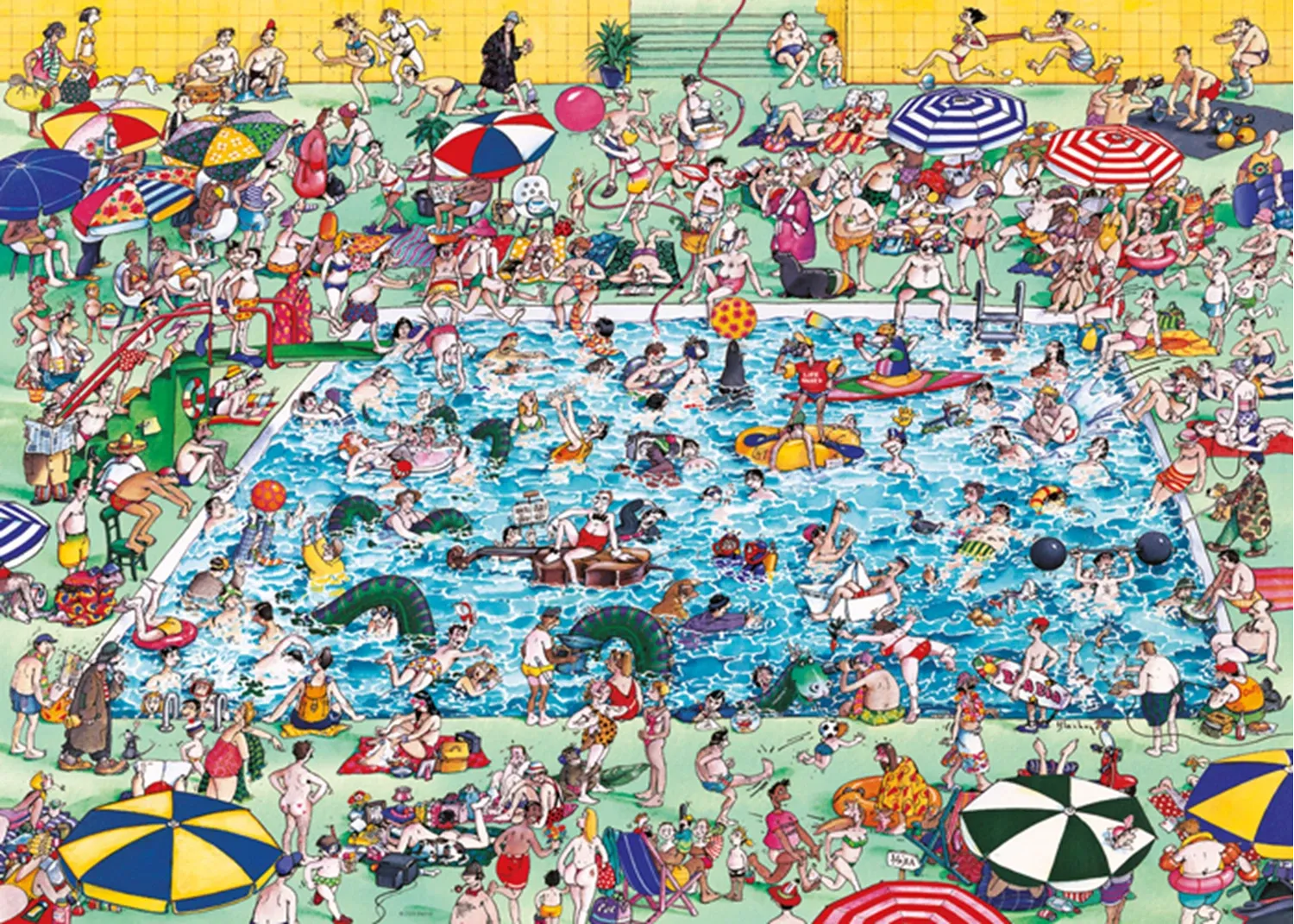 Hinein ins kühle Nass! Und damit auch hinein ins erfrischende Puzzlevergnügen, das sich bei den wunderbar wimmligen Motiven von Roger Blachon eh immer einstellt! Gelegte Größe: 70x50 cm.