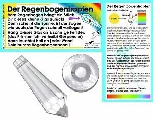 Dieser Bleikristalltropfen von Corvus mit Gummisauger und Schnur wird am Fenster aufgehängt und erzeugt durch Spaltung des Tageslichts viele kleine Regenbogenspektren im Zimmer.