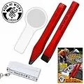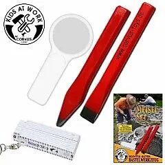 Dieses Set enthält einen flachen und einen spitzen Meißel, eine Lupe und einen Meterstab.
