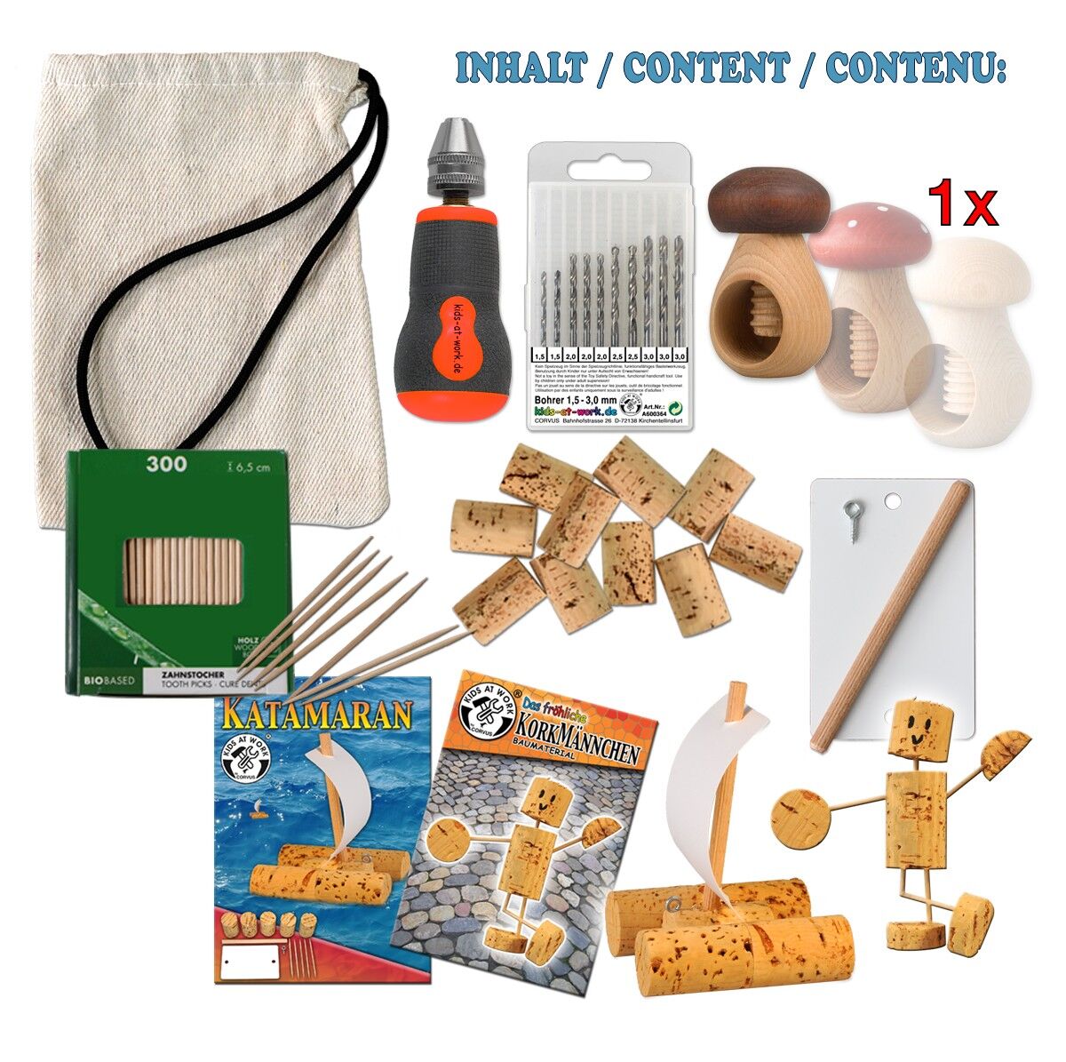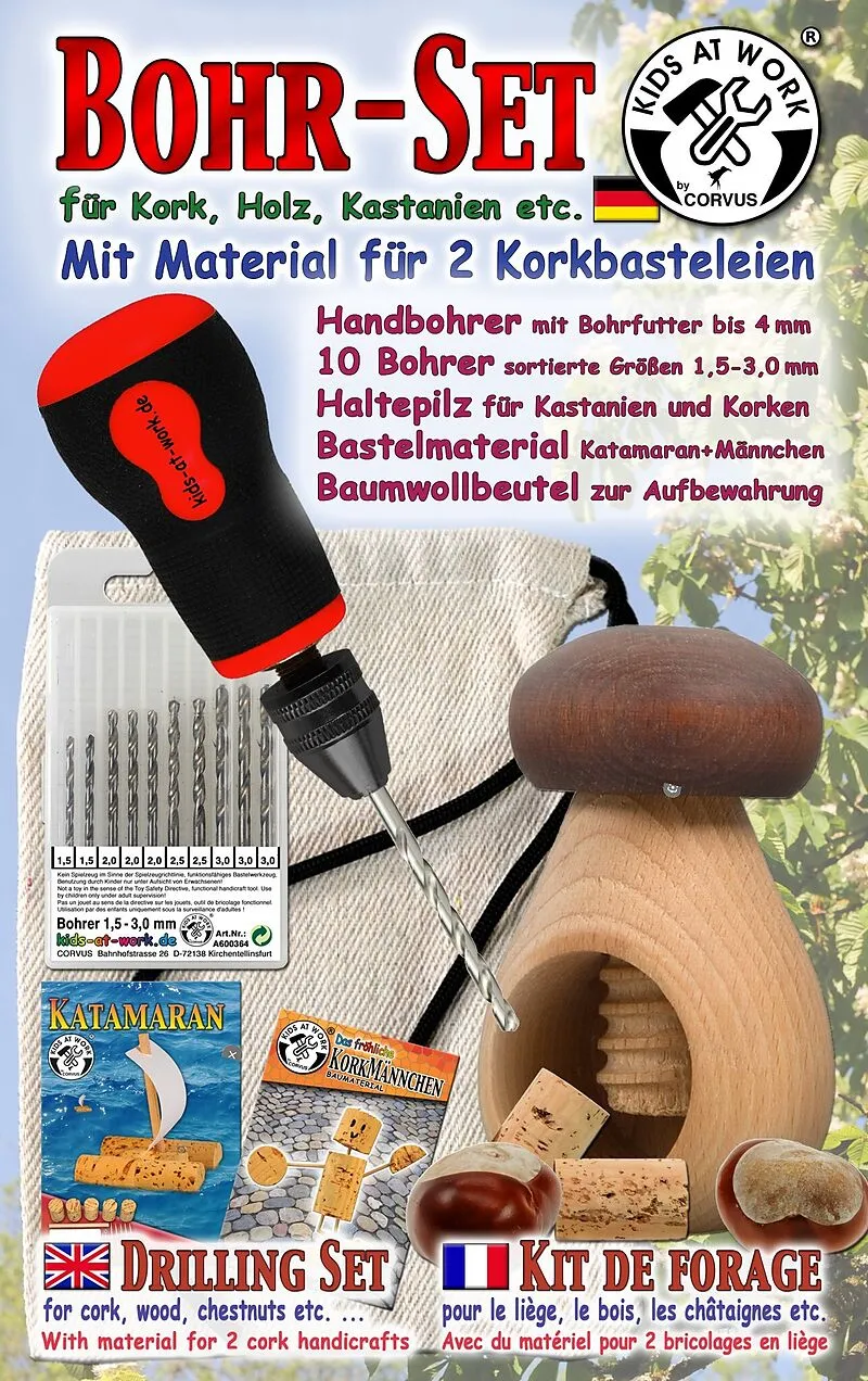 Kids at work, Bohr-Set für Kork, Holz und Kastanien Bohr-Set bestehend aus: 1 Handbohrer mit Bohrfutter bis 4 mm 10 Bohrer von 1,5 bis 3,0 mm Haltepilz für Kastanien und Korken Bastelmaterial Katamaran und Männchen Baumwollbeutel zur Aufbewahrung ...