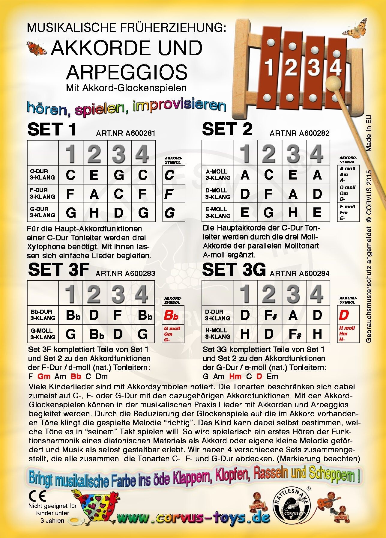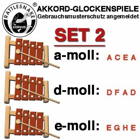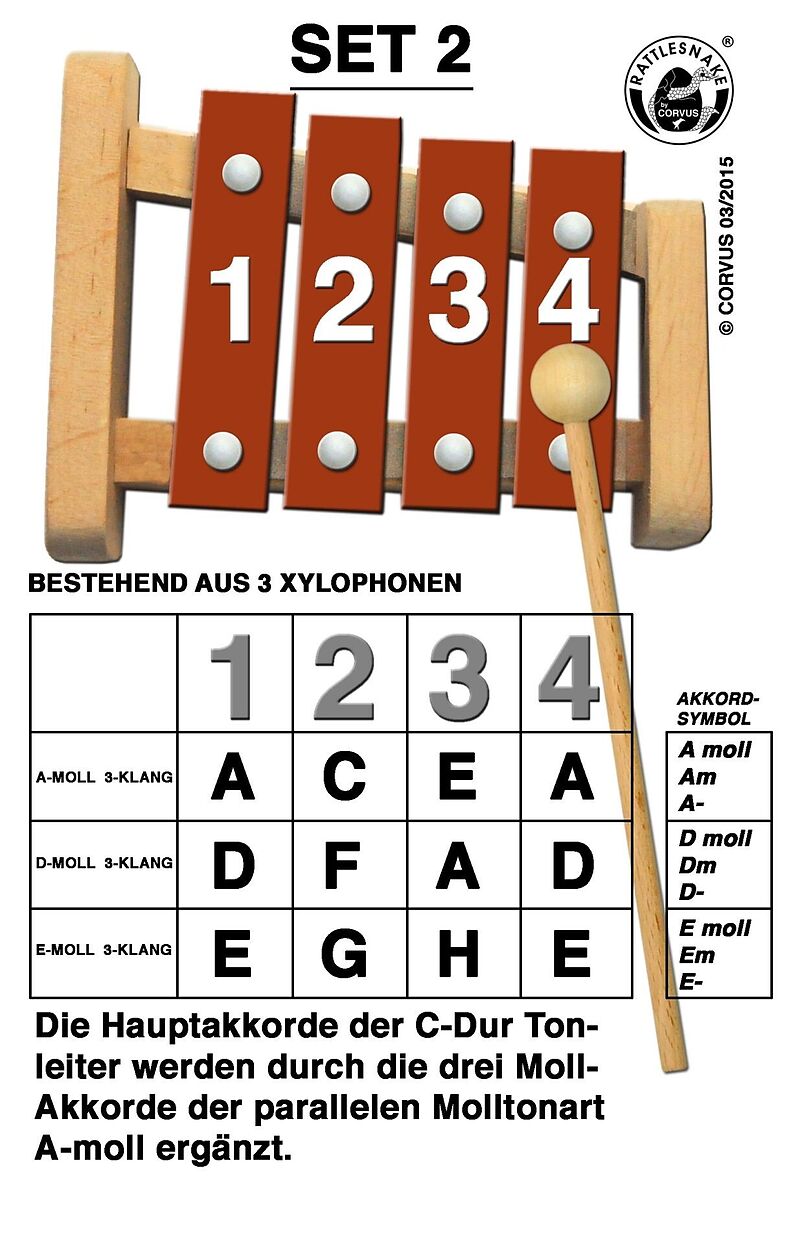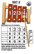 Durch die Reduzierung der Glockenspiele auf die im Akkord vorhandenen Töne klingt die gespielte Melodie richtig. Das Kind kann dabei selbst bestimmen, welche Töne es in seinem Takt spielen will. Set 2 ergänzt Set 1 um die Moll-Akkorde a-moll, d-moll und e-moll...