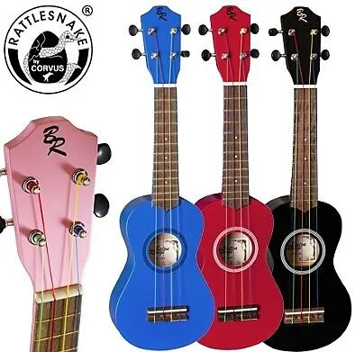 Sopran Ukulele, farbig sortiert. Korpus Linde, Hals Okoume, Griffbrett Walnuss, 12 Bünde, offene Gitarrenmechaniken mit schwarzen Flügeln, Mensur 340 mm, Sattelbreite 35 mm, Aquila Saiten in Boomwhackers Farben, Ggrün, Crot, Egelb, Ablau. Lieferung: 1 Stück, F...