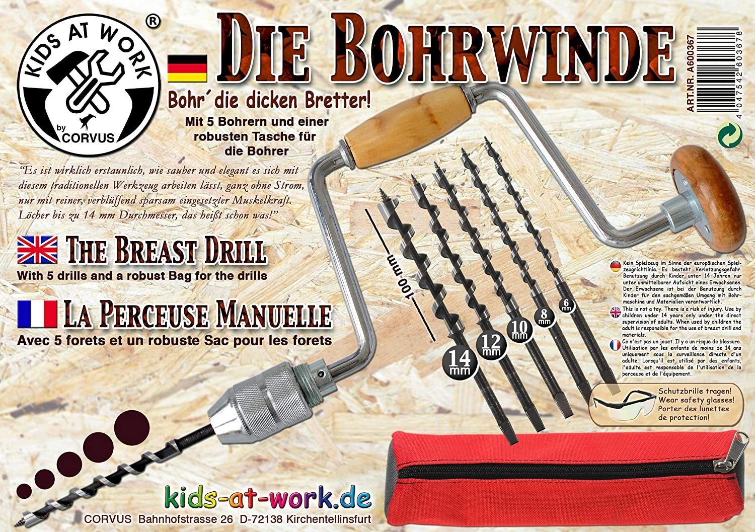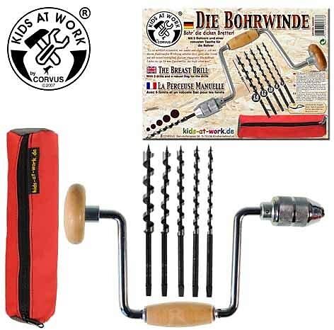 Einfache, kleine Bohrwinde (auch als Bohrkurbel oder Brustleier bekannt), hier mit 5 Holzbohrern ( 6,8,10,12 und 14 mm) nebst einer robusten Tasche zur Aufbewahrung der Bohrer. Es ist wirklich erstaunlich, wie sauber und elegant es sich mit diesem traditionell...