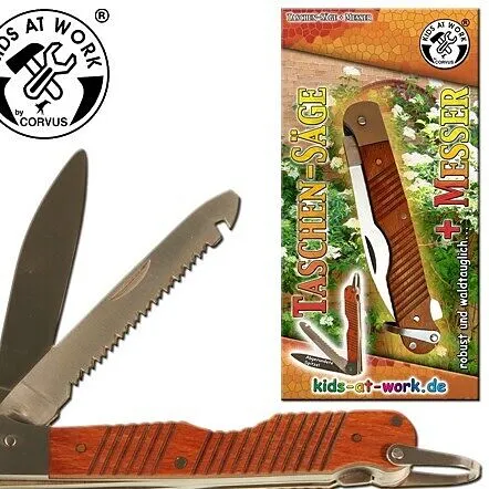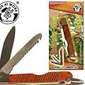 Ein großes Taschenmesser (zusammengeklappt 11,5 cm)mit einer Säge dabei. Messerklinge leicht abgerundet. Die Klinge rastet im aufgeklappten Zustand ein. Länge von Säge und Klinge unter 9 cm. Dekorativer Holzgriff mit Metallbügel. Sehr stabil!