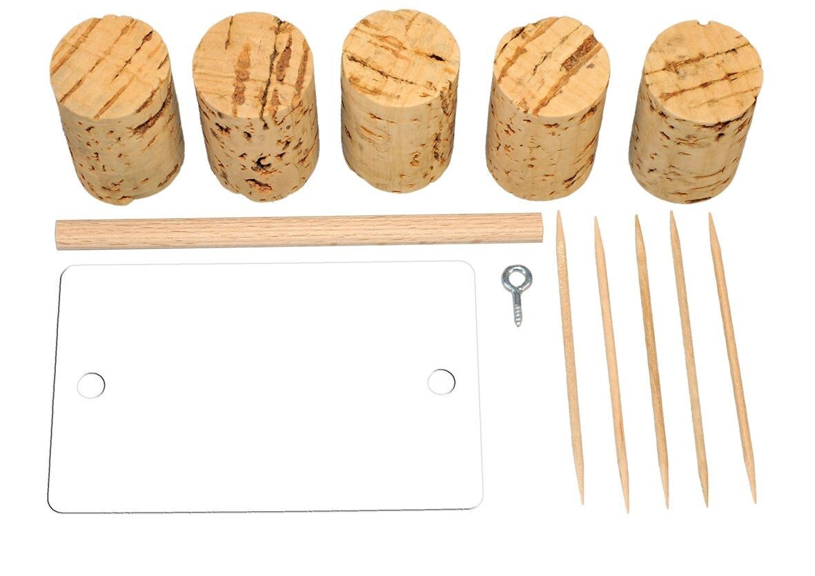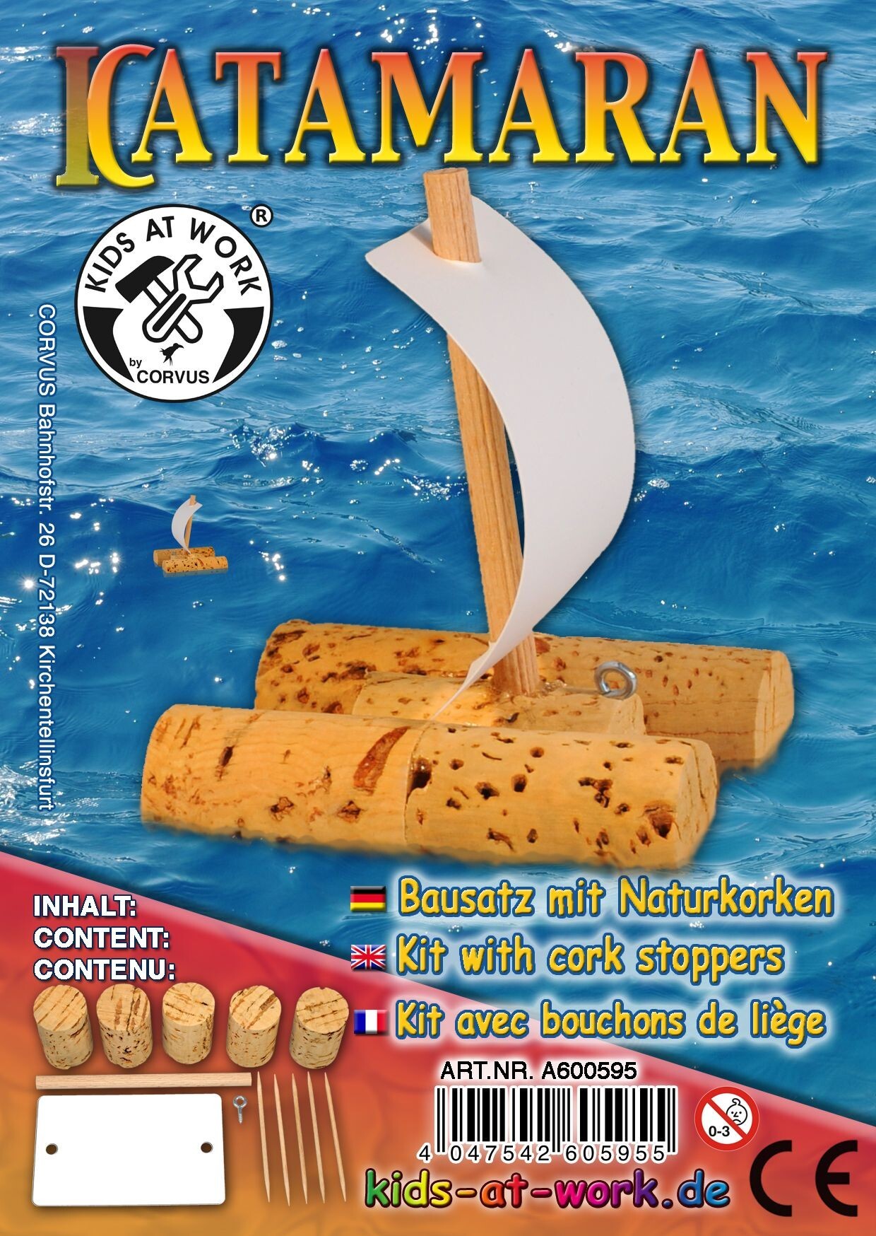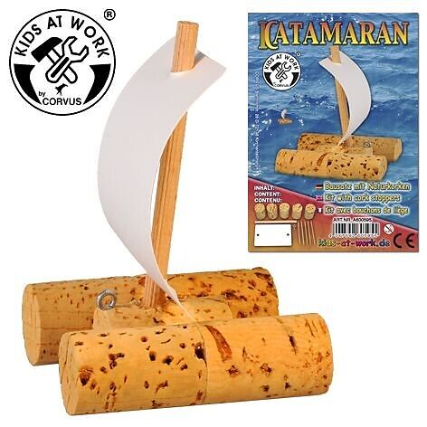 Maritimes Bastelset: Aus Naturkorken, Ringschraube, Mast (Buchenholz) und Segel (Kunststoff, bemalbar) wird ein windschnittiger Katamaran. Höhe 10,5 cm.