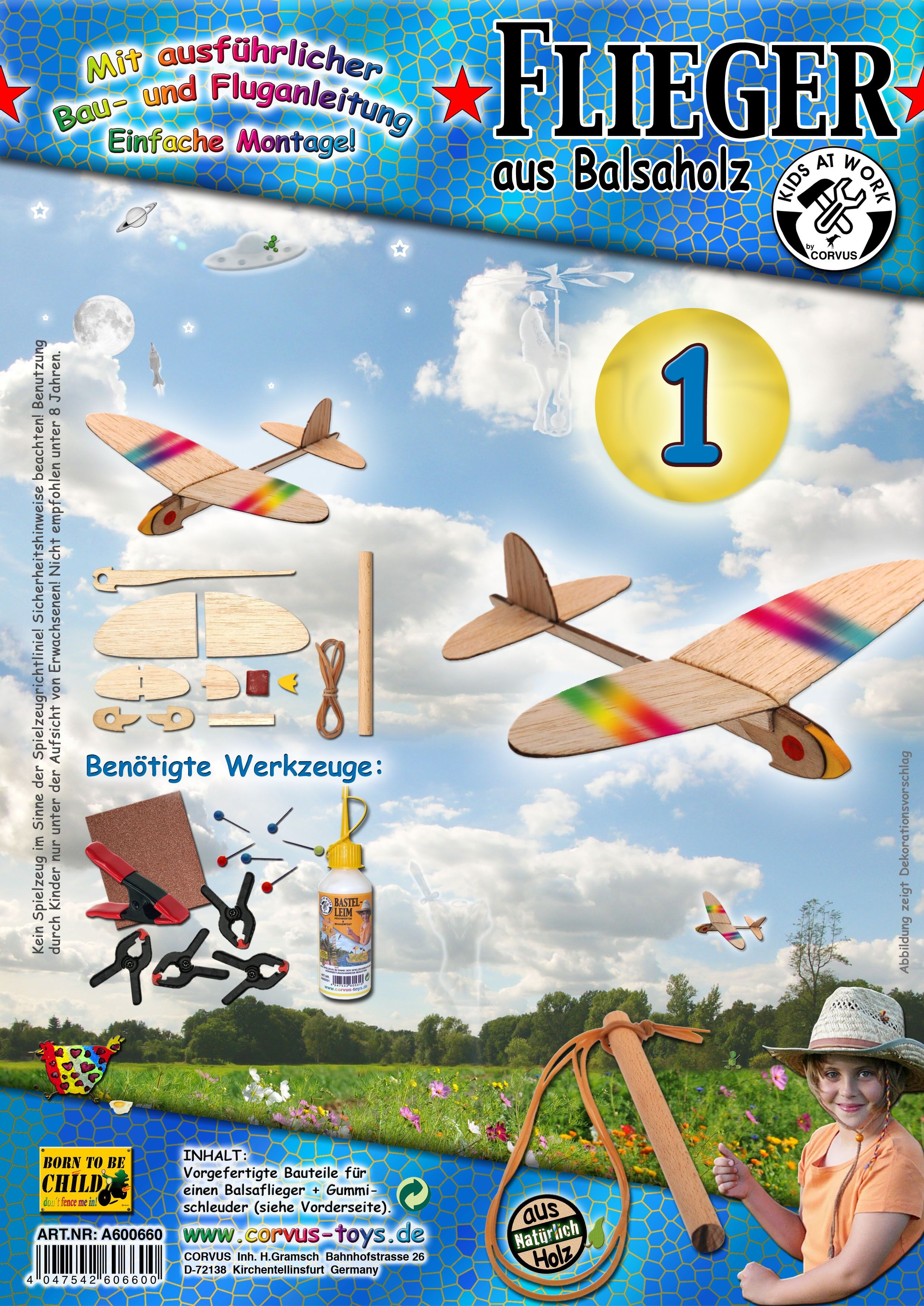 Spannweite: 17 cm. Bausatz aus Balsaholz, einfache Montage. Inhalt: Vorgefertigte Bauteile für einen Balsaflieger, 1x Gummischleuder, ausführliche Bau- und Fluganleitung. Benötigte Hilfsmittel, Werkzeug, Leim und Schleifpapier sind in der Packung nicht enthalt...