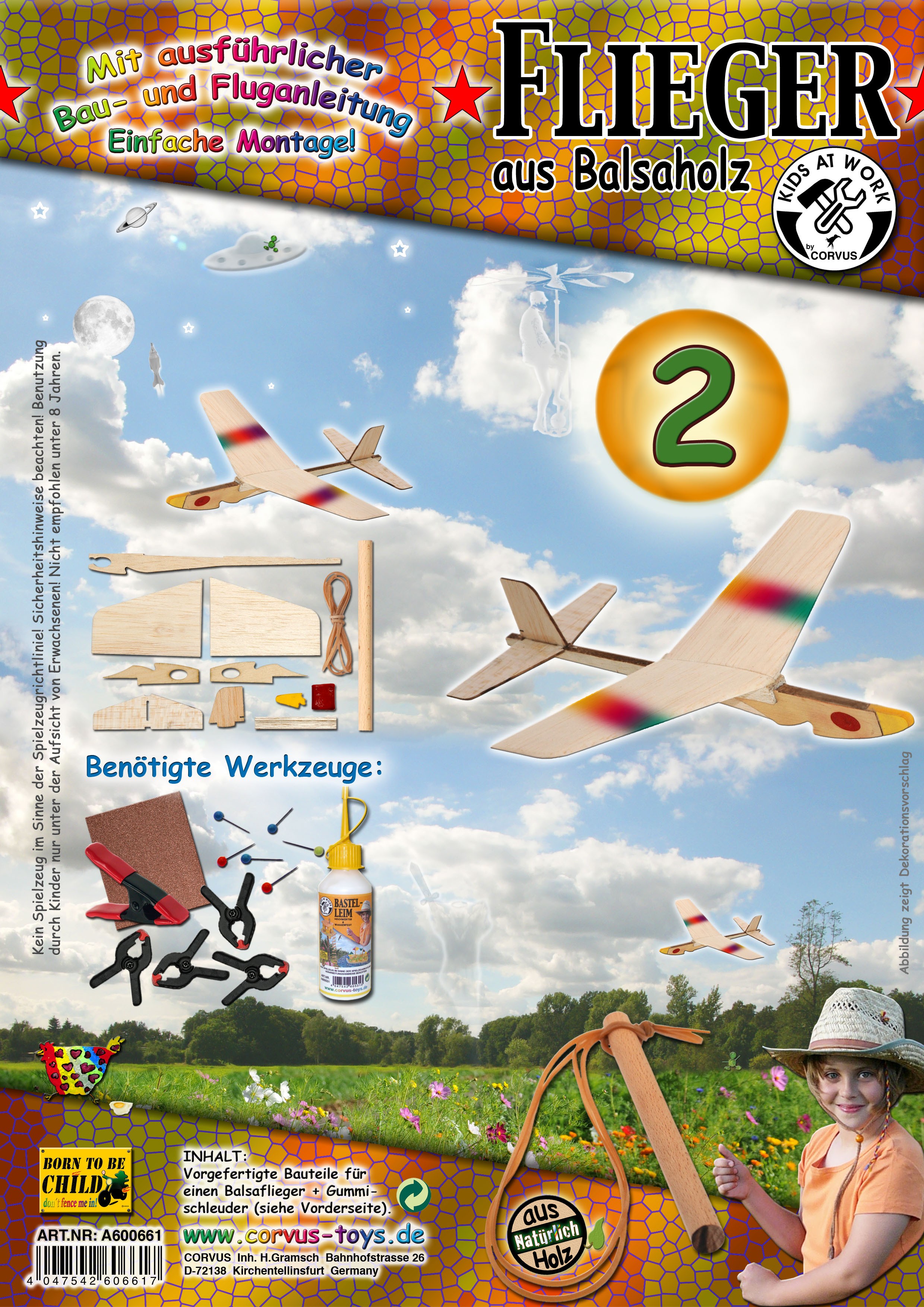 Spannweite: 17 cm, Bausatz aus Balsaholz, einfache Montage. Inhalt: Vorgefertigte Bauteile für einen Balsaflieger, 1 Gummischleuder, ausführliche Bau- und Fluganleitung. Benötigte Hilfsmittel, Werkzeug, Leim und Schleifpapier sind in der Packung nicht enthalte...