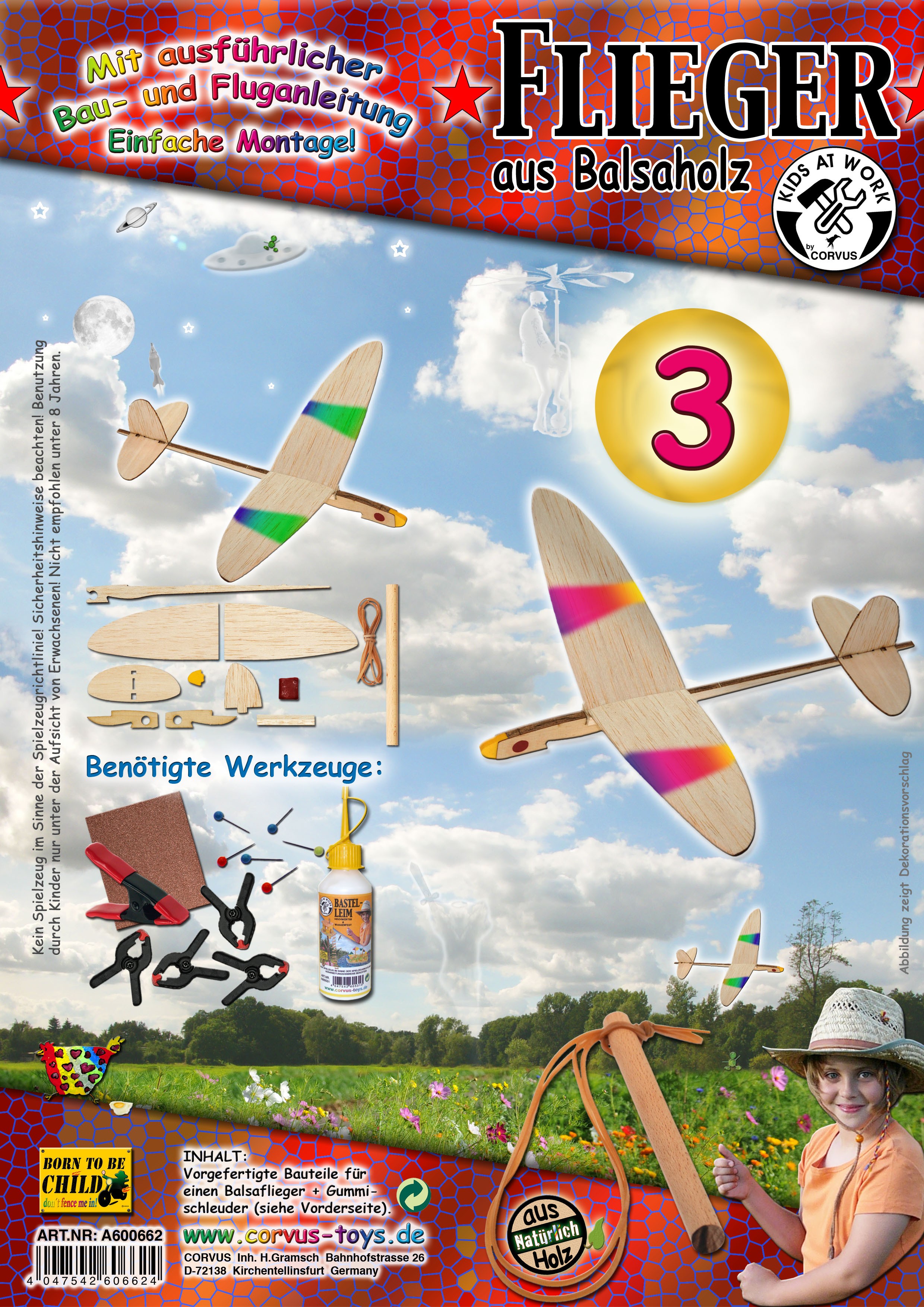 Inhalt: Vorgefertigte Bauteile für einen Balsaflieger, 1 Gummischleuder, ausführliche Bau- und Fluganleitung.