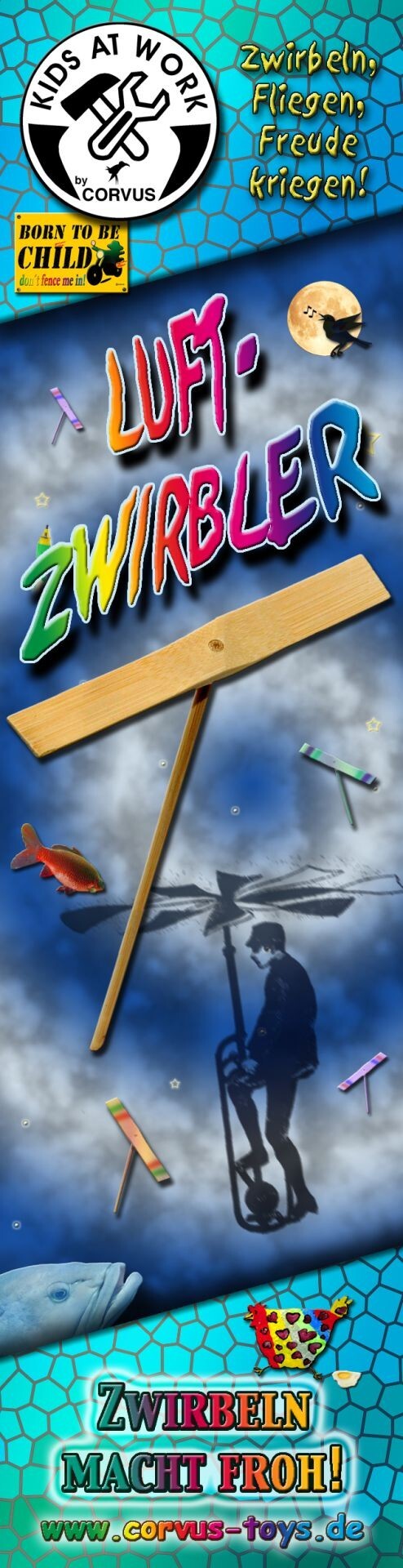 Luftzwirbler aus Bambus, kein Plastik! Wer es nicht kennt: Einfach in die Hand nehmen, wie einen Quirl drehen und loslassen, schon schwebt der Luftzwirbler davon.