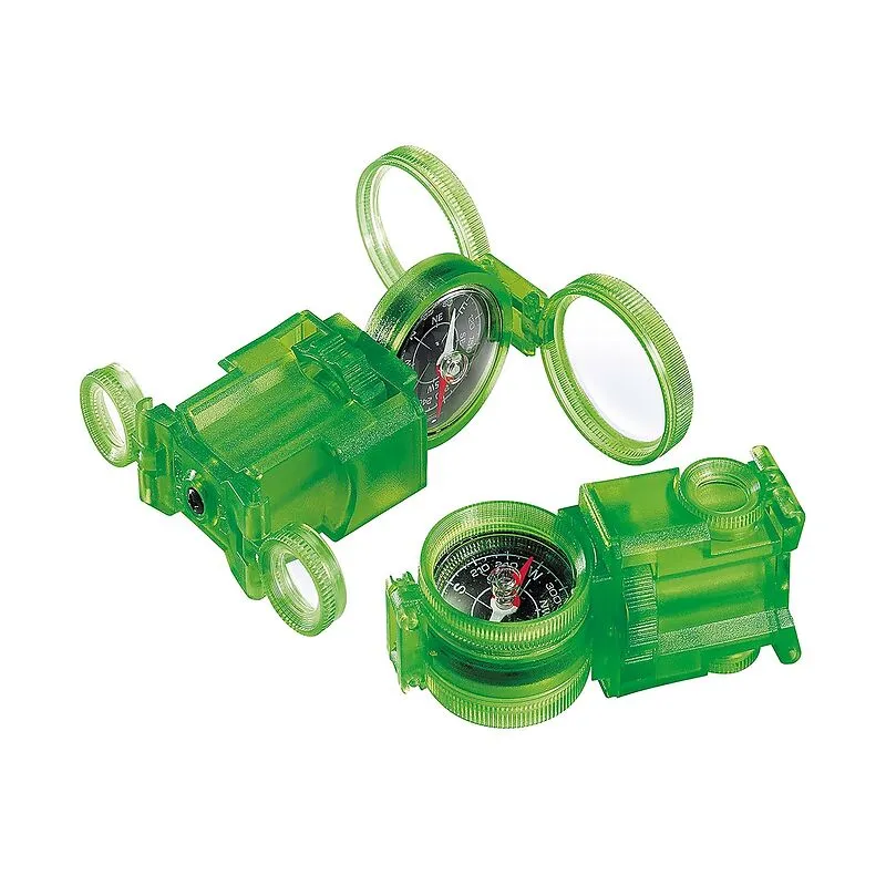 Multifunktionale Entdeckeroptik: Fernglas, Lupe, Kompass, Vergrösserungs- u. Beobachtungssspiegel sowie Stereoskop für 3D-Sicht.