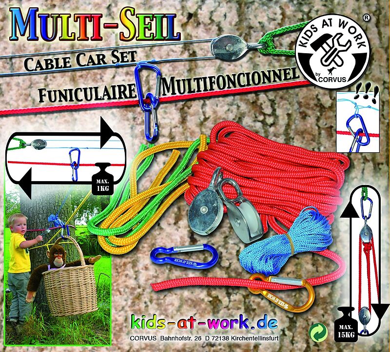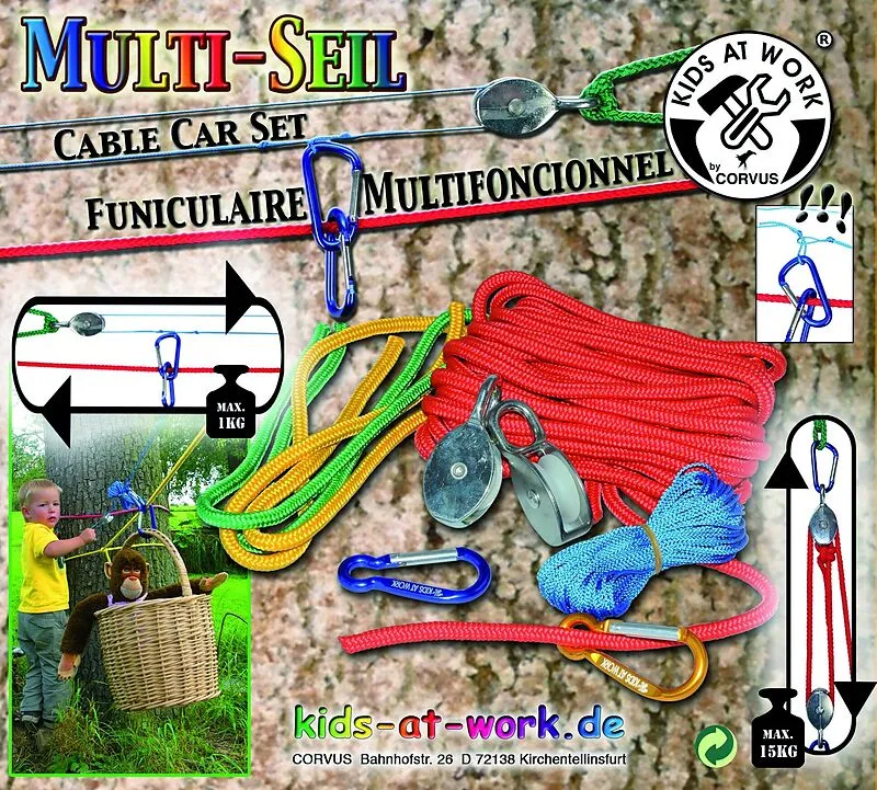 Multi-Seil 10 m / Flaschenzug / Seilbahn Bastelwerkzeug.Mit diesem Set lassen sich mehrere schöne Anwendungen realisieren: Seilbahn, Flaschenzug, Bau von Zelthäusern, und vieles mehr... Das Zugseil läuft über je eine Umlenkrolle (Berg- u. Talstation) im Kreis ...