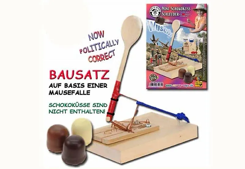 Ähnlich wie eine Mausefalle kann die Mini-Schokokuss-Schleuder zusammengebaut werden.