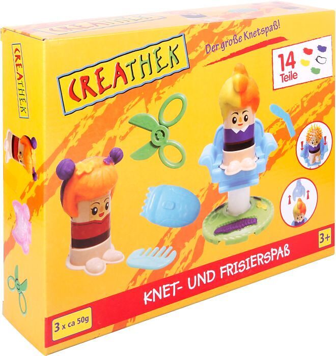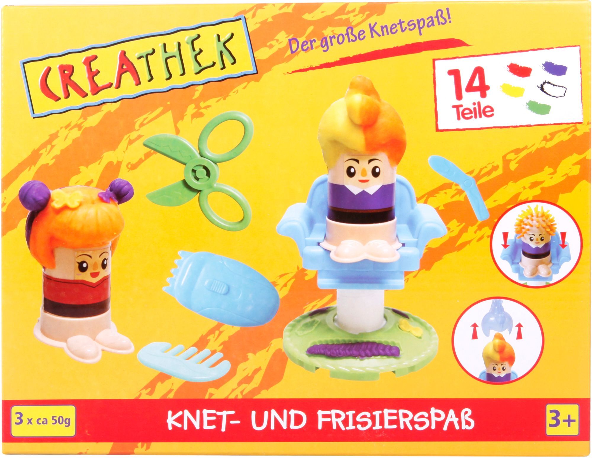 Creathek Knet- und Frisierspaß, 14 Teile Creathek Knet- und Frisierspaß, 14 Teile. Bestehend aus 3 Dosen Knete mit je 50 Gramm Knete, 1 Schere, 1 Kamm, 1 Rasierer, 1 Rasiermesser, 1 Frisierstuhl, 2 Frisierpuppen mit den dazugehörigen Aufklebern und 2 Frisierfo...