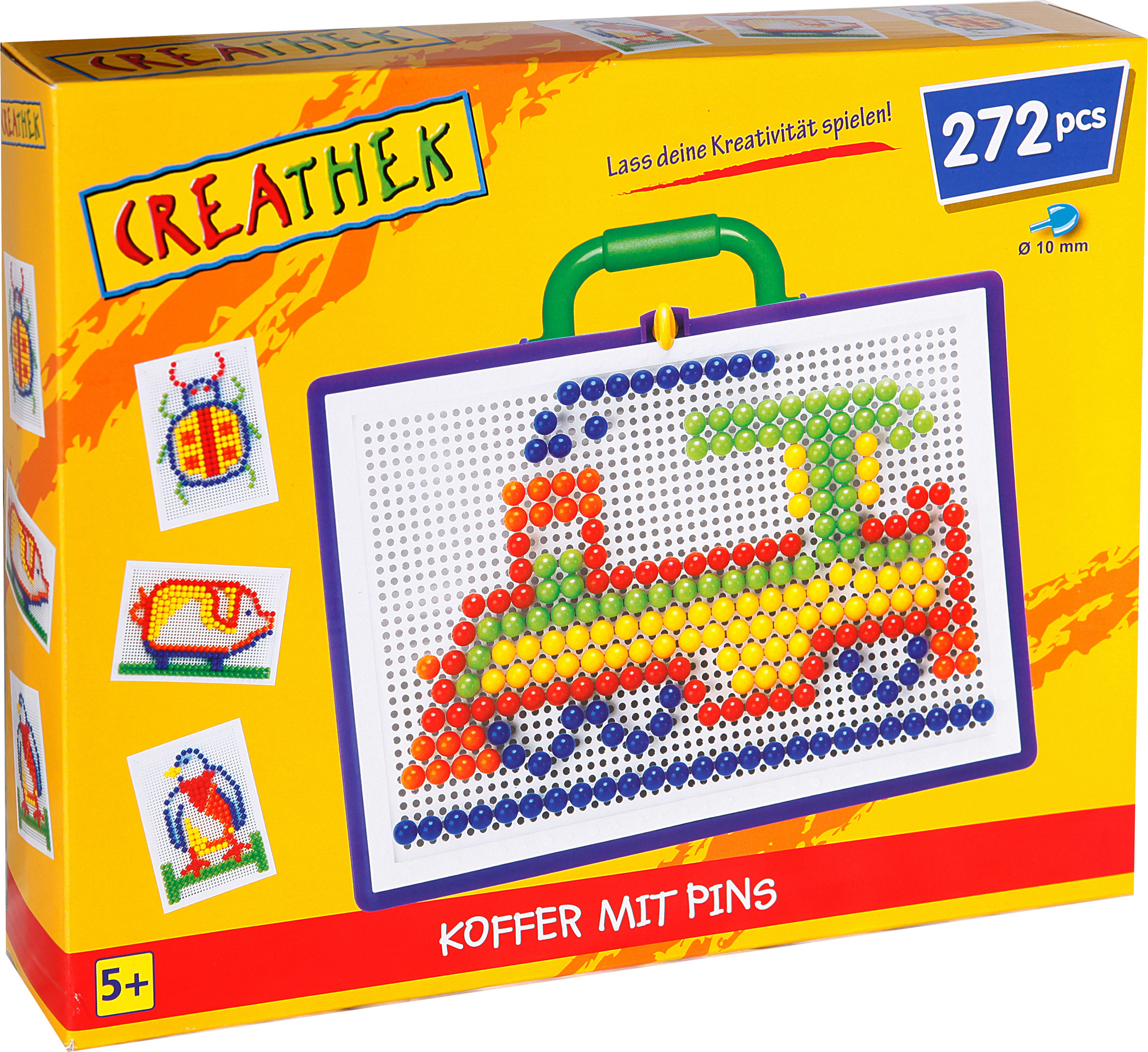 Creathek Koffer mit 272 Pins, Durchmesser ca. 10 mm. Aus hochwertigem Kunststoff in leuchtenden Farben. Maße ca. 29,5x25,5x4 cm. Für Kinder ab 5 Jahren.