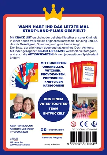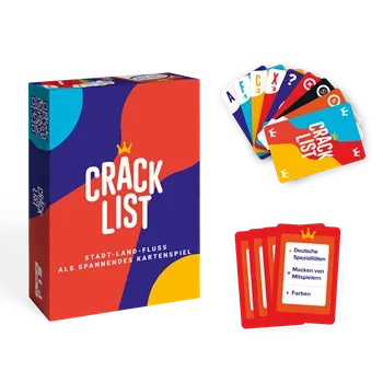 Crack List Wann habt ihr das letzte Mal Stadt-Land-Fluss gespielt? Mit Crack List erscheint der beliebte Klassiker unserer Kindheit in einer neuen Version: als originelles Kartenspiel für Jung und Alt, das für Geselligkeit, Spannung und gute Laune sorgt. Der E...