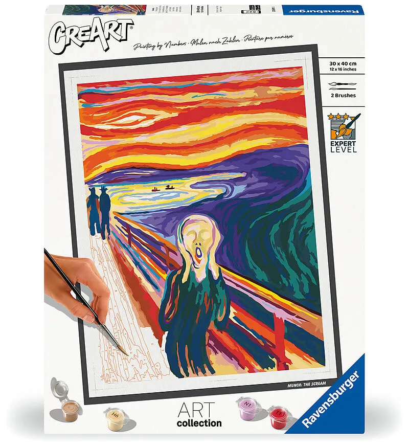 Die Malen nach Zahlen Art Collection, inspiriert von Meisterwerken berühmter Künstler wie van Gogh, Monet, Frida Kahlo und vielen anderen, bringt dir die Magie der Kunst nach Hause. Das beeindruckende Motiv Munch: Der Schrei sorgt für großartigen Malspaß für E...
