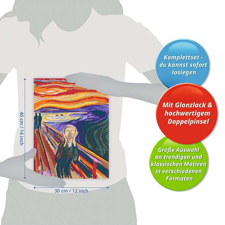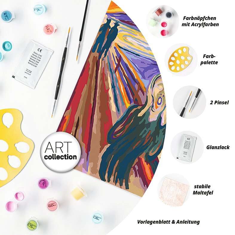 Die Malen nach Zahlen Art Collection, inspiriert von Meisterwerken berühmter Künstler wie van Gogh, Monet, Frida Kahlo und vielen anderen, bringt dir die Magie der Kunst nach Hause. Das beeindruckende Motiv Munch: Der Schrei sorgt für großartigen Malspaß für E...