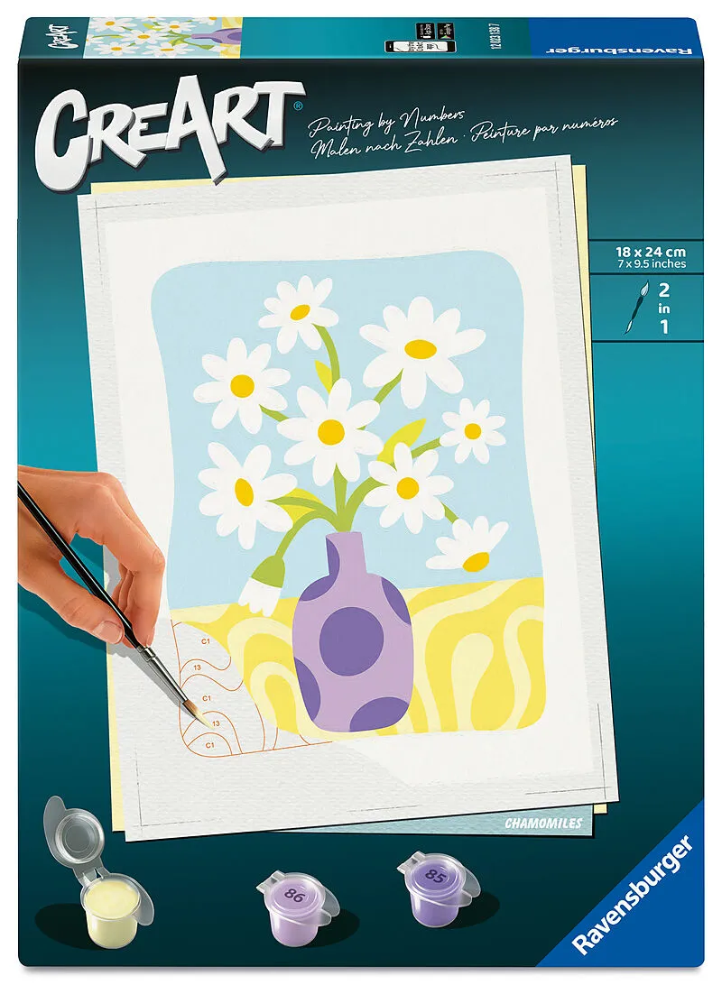 Coole Designs, leuchtende Farben und glänzender Lack für ein perfektes Finish. Das trendige Motiv Kamille bietet großartigen Malspaß für Erwachsene ab 12. Die Motivlinien sind bereits vorgedruckt und nummeriert und müssen mit den fertig gemischten Acrylfarben ...