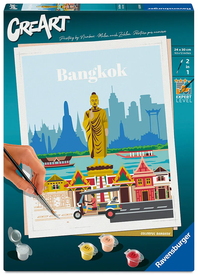 New York, Paris, Mailand und viele mehr! Entdecken Sie die schönsten Städte der Welt und holen Sie sich mit unseren Malen nach Zahlen-Sets ihren Zauber direkt zu sich nach Hause! Das trendige Motiv Farbenfrohes Bangkok bietet großartigen Malspaß für Erwachsene...