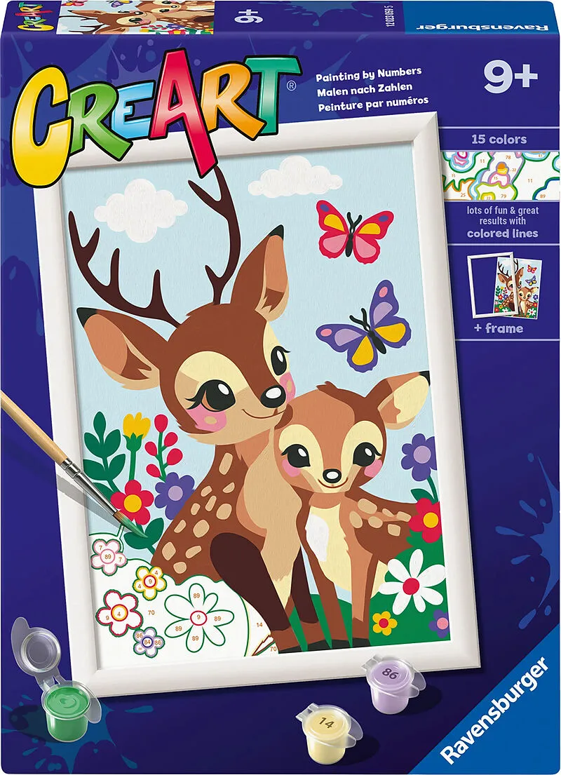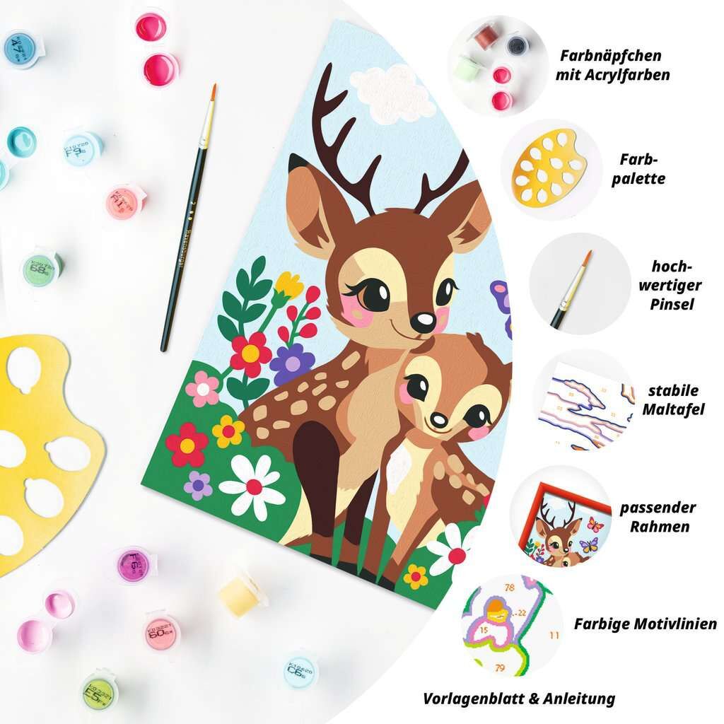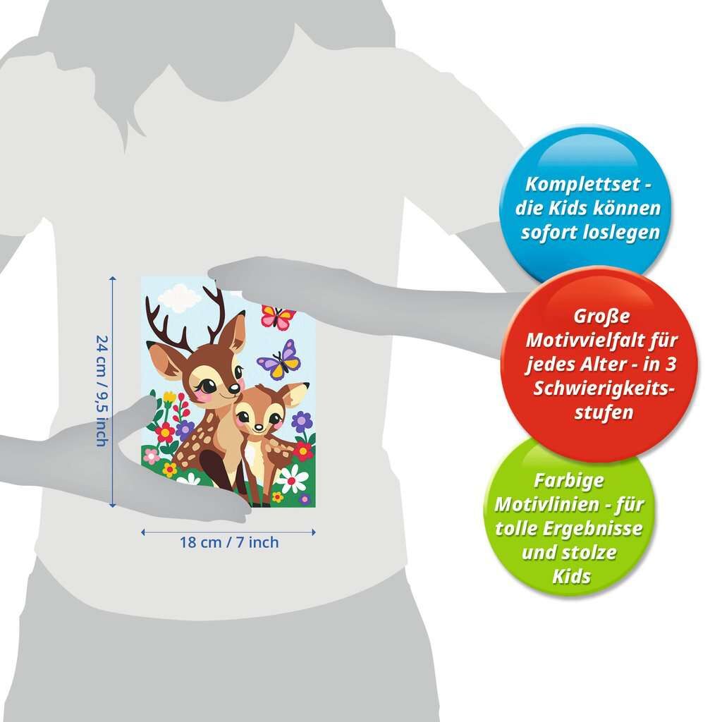 Farbige Motivlinien: Größerer Malspaß & ein schöneres Ergebnis! Dank der farbigen Motivlinien, können die Kinder das ganze Motiv Fröhliche Hirsche und die Farben schneller erkennen. Der Pinsel hat eine gute Führung und so entsteht ein perfektes Bild. Die schön...