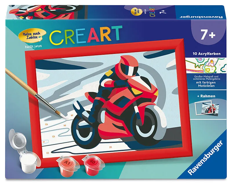 Farbige Motivlinien: Größerer Malspaß & ein schöneres Ergebnis!Dank der farbigen Motivlinien, können die Kinder das ganze Motiv Motorradfahrer und die Farben schneller erkennen. Der Pinsel hat eine gute Führung und so entsteht ein perfektes Bild.Die schöne...