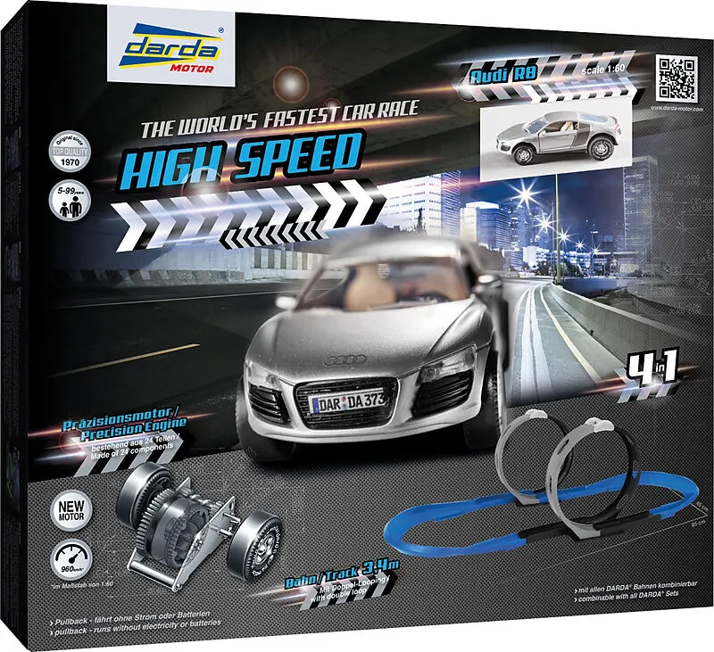 DARDA High Speed. Extra große Einsteigerbahn mit zwei Loopings. Inkl. Audi R8 silber. Fahrbahnlänge: 3,4 m. Verpackt in buntem Verkaufskarton mit ausführlichen Produktinformationen. 4 Aufbauvarianten möglich. Geeignet für Kinder ab 5 Jahren. Verpackt in Faltsc...