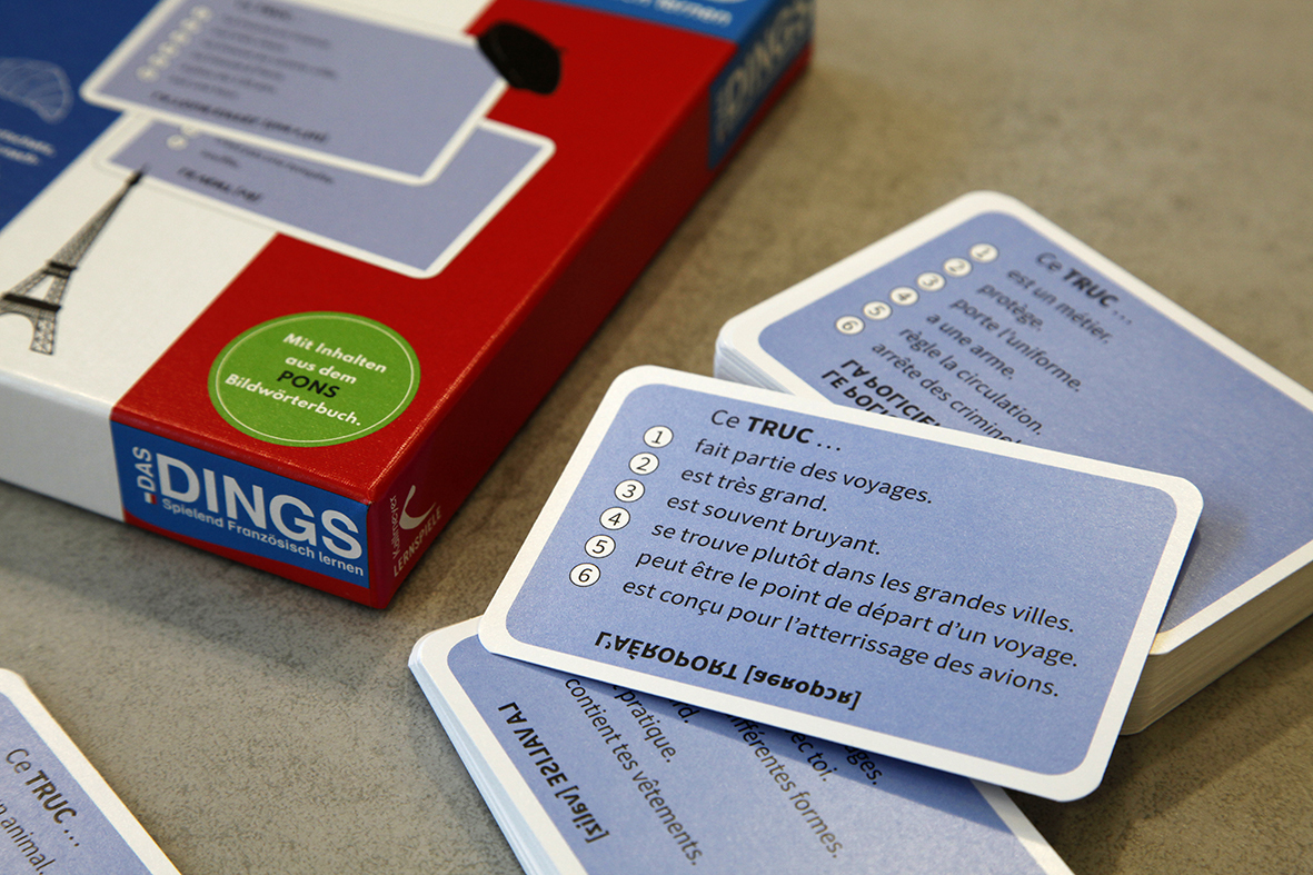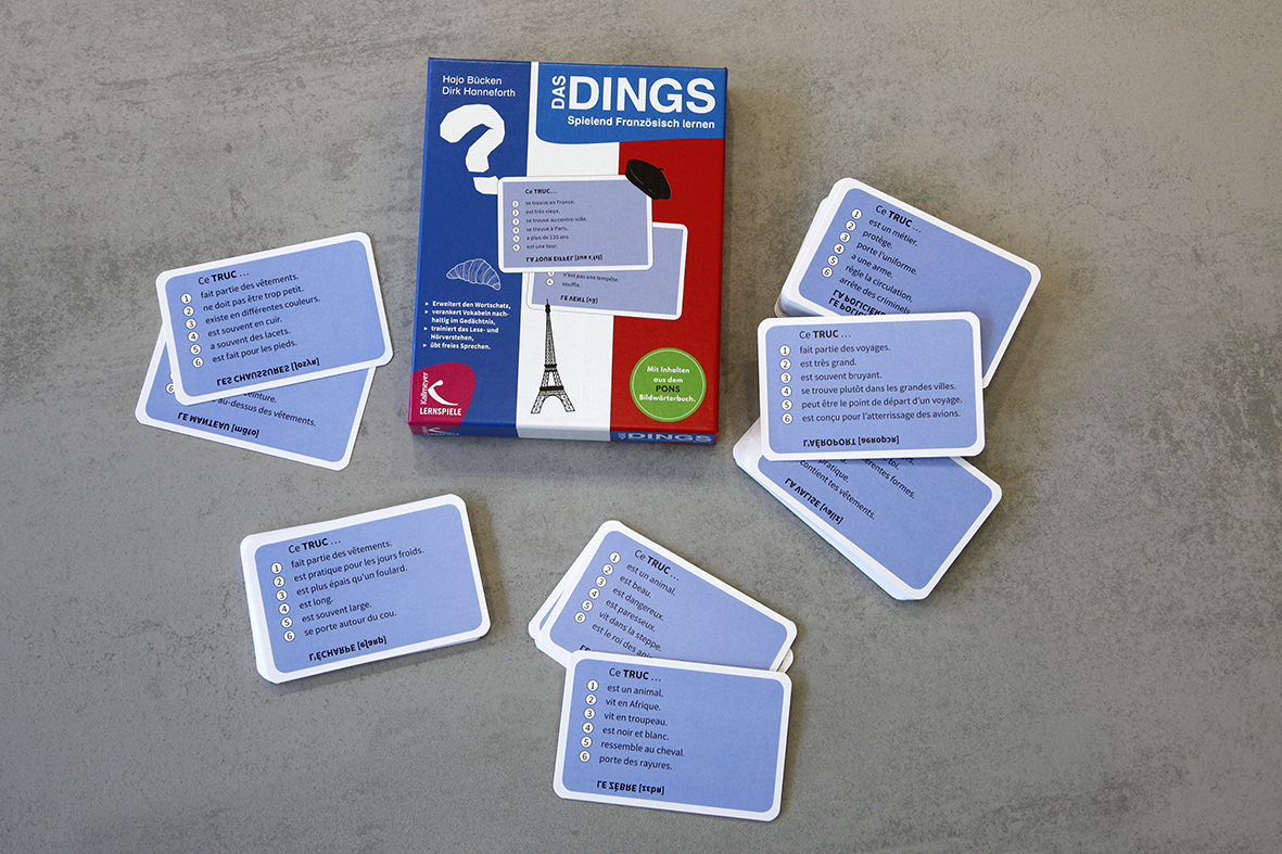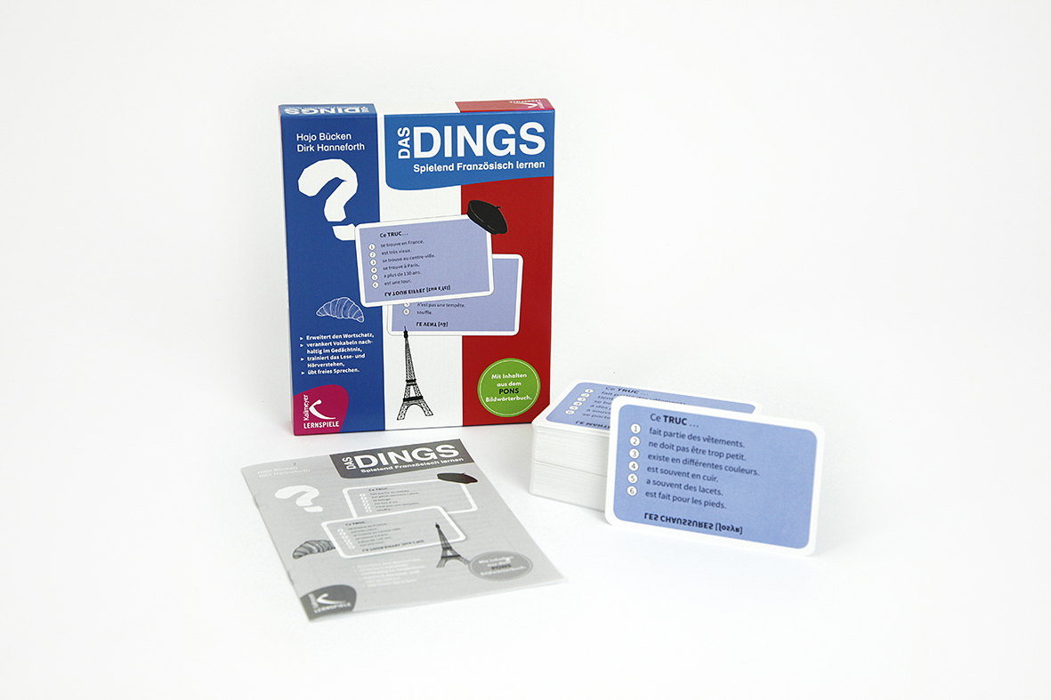 DAS DINGS: Spielend Französisch lernen ist ein kommunikatives Ratespiel für Französischlernende mit Sprachlernniveau A1 bis B1 von 11 bis 99 Jahren. Auf einen Blick: Wer DAS DINGS: Spielend Französisch lernen spielt, erweitert den Wortschatz, verankert Vokabe...