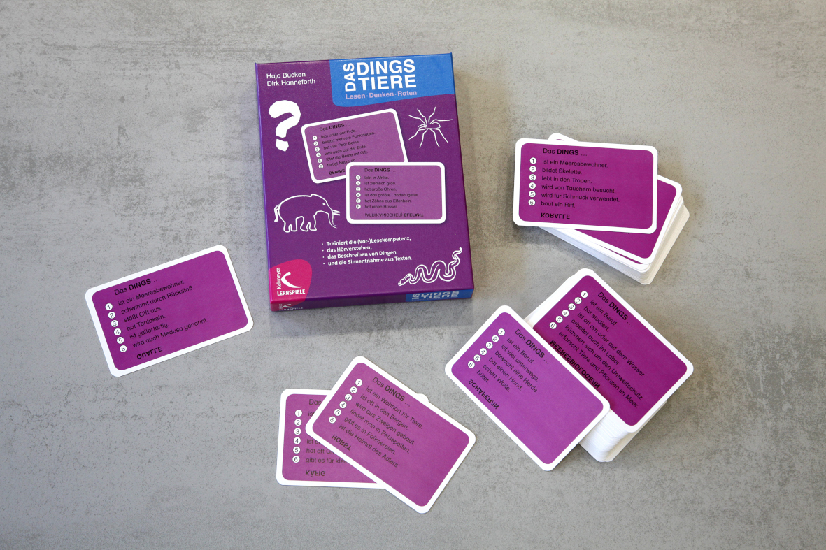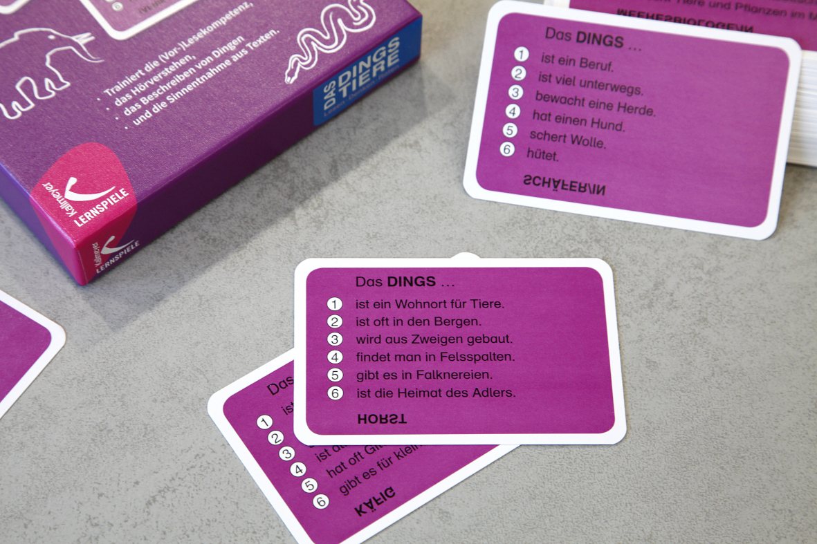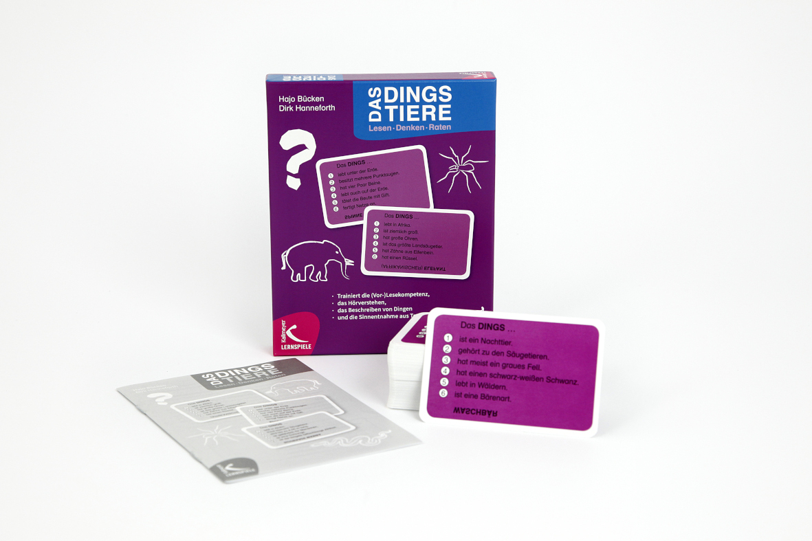 DAS DINGS: Tiere ist ein kommunikatives Ratespiel, das (Vor-)Lesen und Zuhören trainiert.