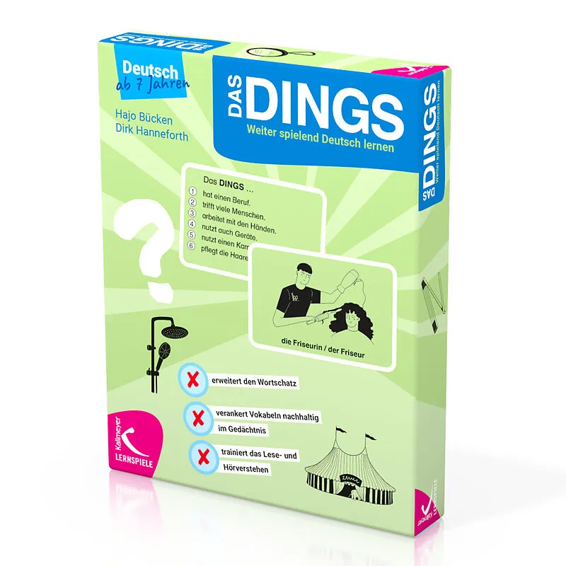 DAS DINGS: Weiter spielend Deutsch lernen ist ein kommunikatives Ratespiel für Deutschlernende mit Sprachlernniveau A1 bis B1 von 7 bis 99 Jahren. Auf einen Blick: Wer DAS DINGS: Weiter spielend Deutsch lernen spielt erweitert den Wortschatz, verankert Vokabe...
