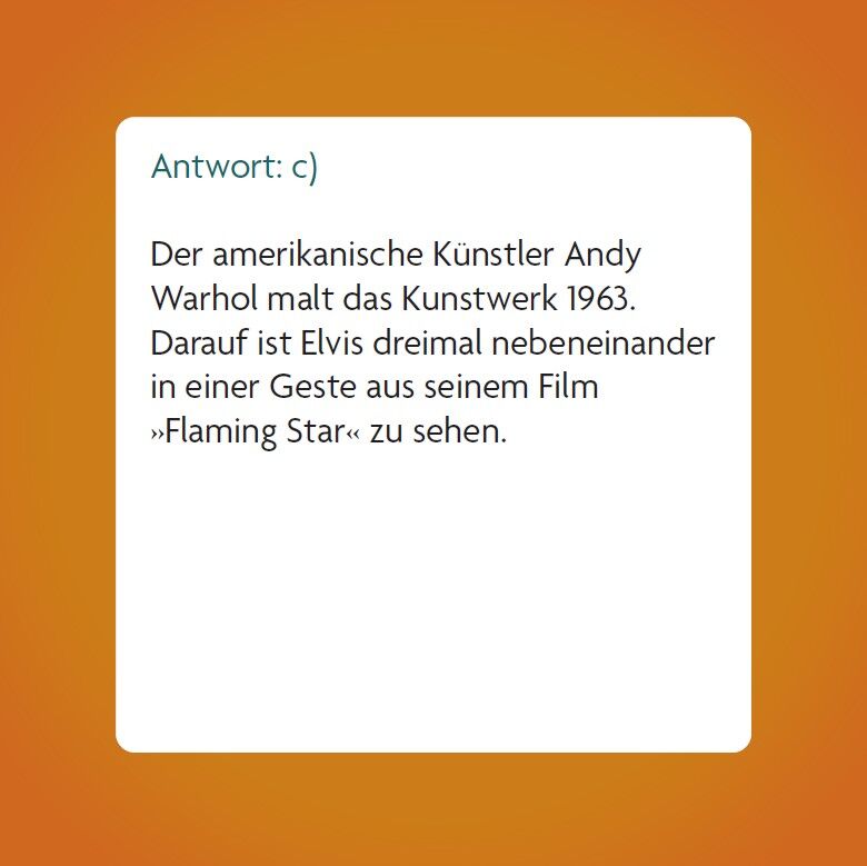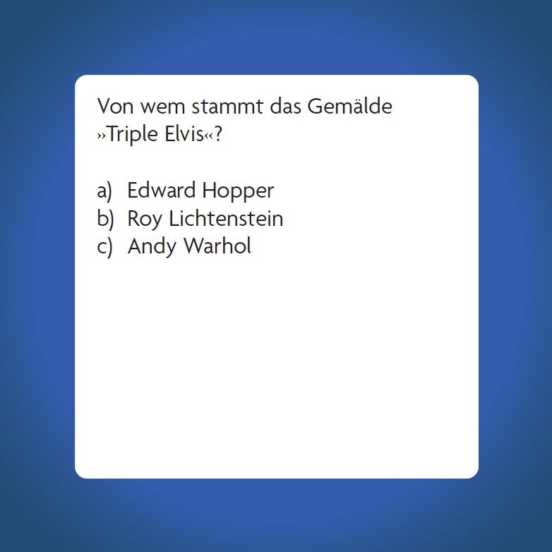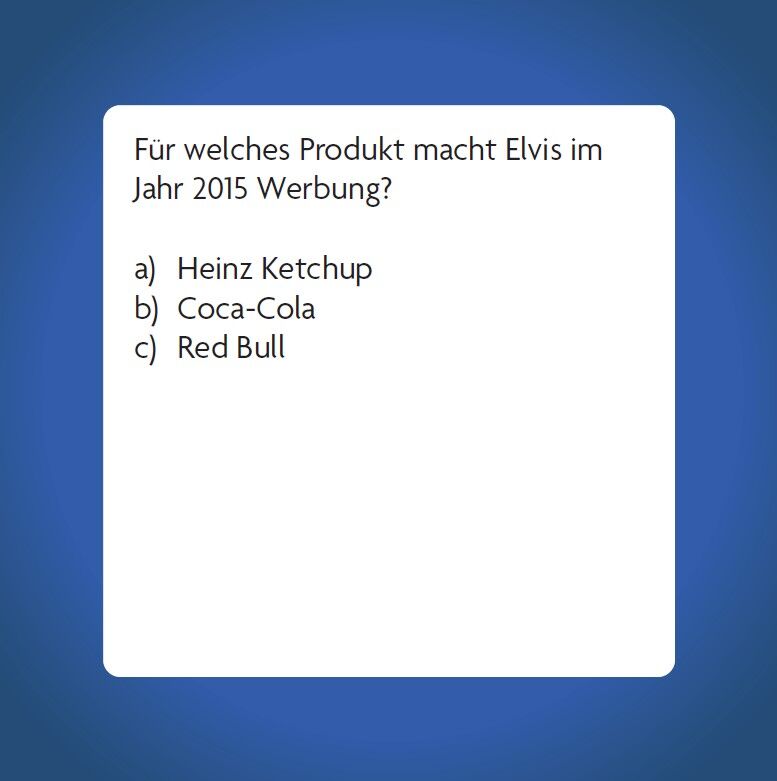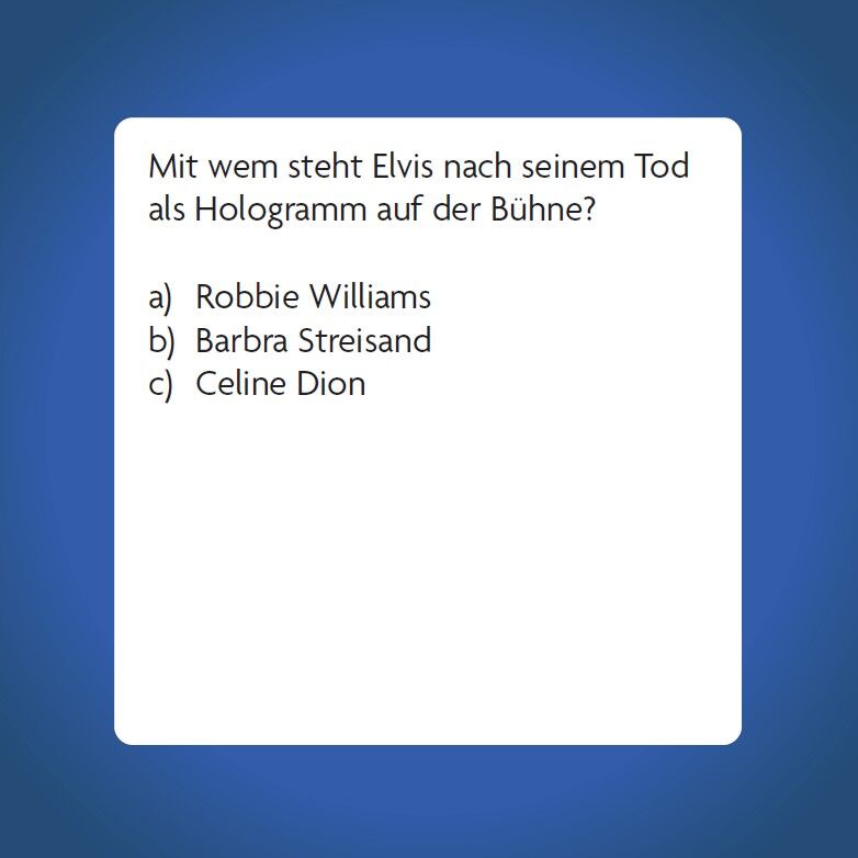 Elvis Presley Quiz Die Legende des Rock'n'Roll entdecken Das Elvis-Quiz mit 66 Karten ist das perfekte Spiel für Erwachsene, die ihr Wissen über den King des Rock and Roll testen möchten. Von Elvis Hits wie Love Me Tender bis zu weniger bekannten Fa...