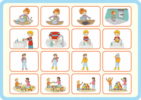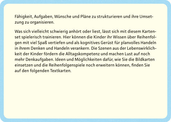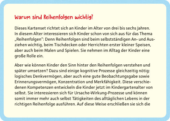Bildkarten zum Spielen und Lernen für Kinder: Was kommt zuerst? Reihenfolgen erkennen. Dieses Kartenset richtet sich an Kinder im Alter von 3 bis 6 Jahren: Die 32 Bildkarten zeigen acht Situationen aus ihrer Lebenswirklichkeit, die in die richtige Abfolge zu b...