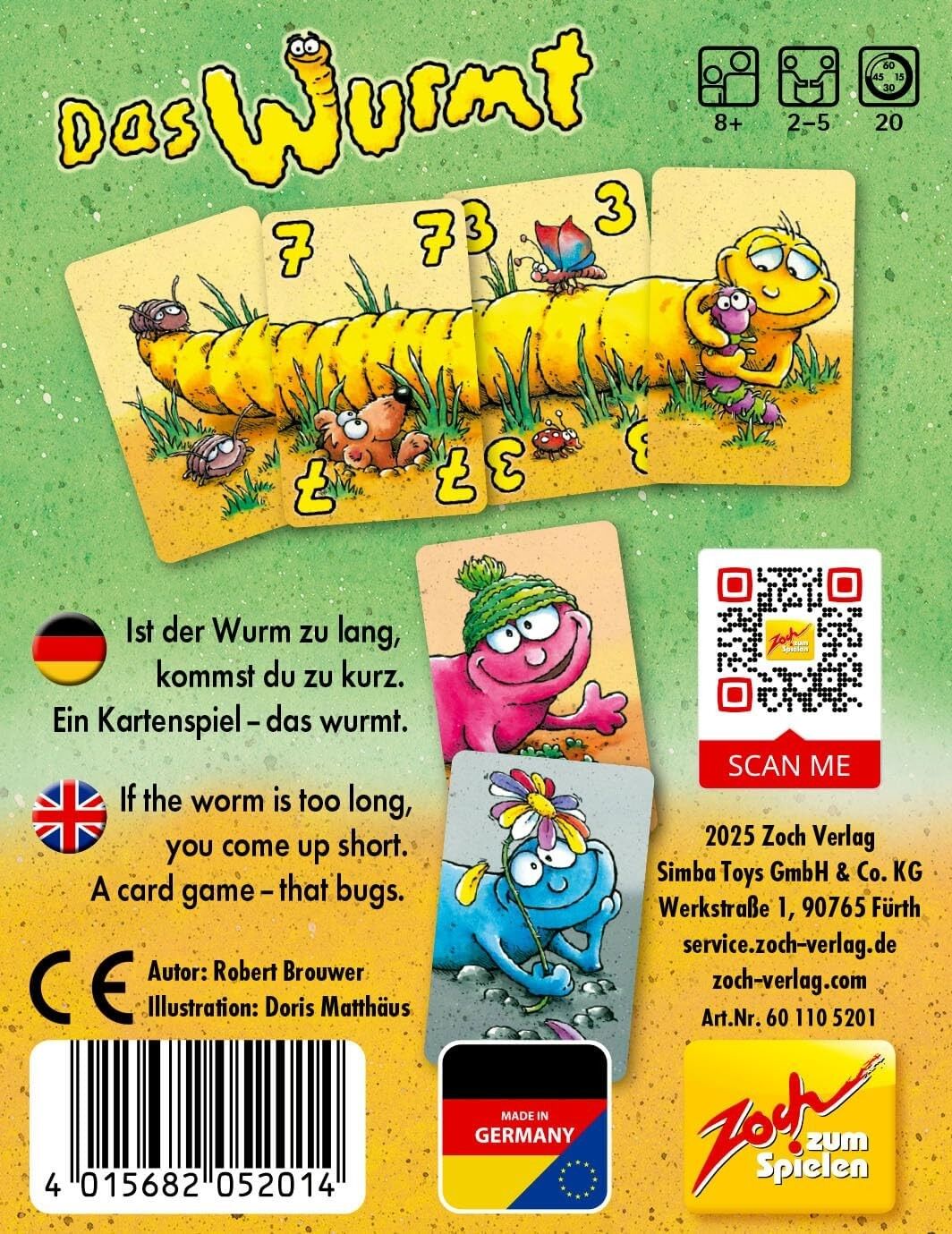Lang, länger, zu lang und schon wurmts! In diesem Spiel dreht sich alles um das richtige Maß: Wer schafft es, die Würmer so wachsen zu lassen, dass sie die ideale Länge erreichen und möglichst viele Punkte einbringen? Spielinhalt: 110 Spielkarten, 1 Spielregel...