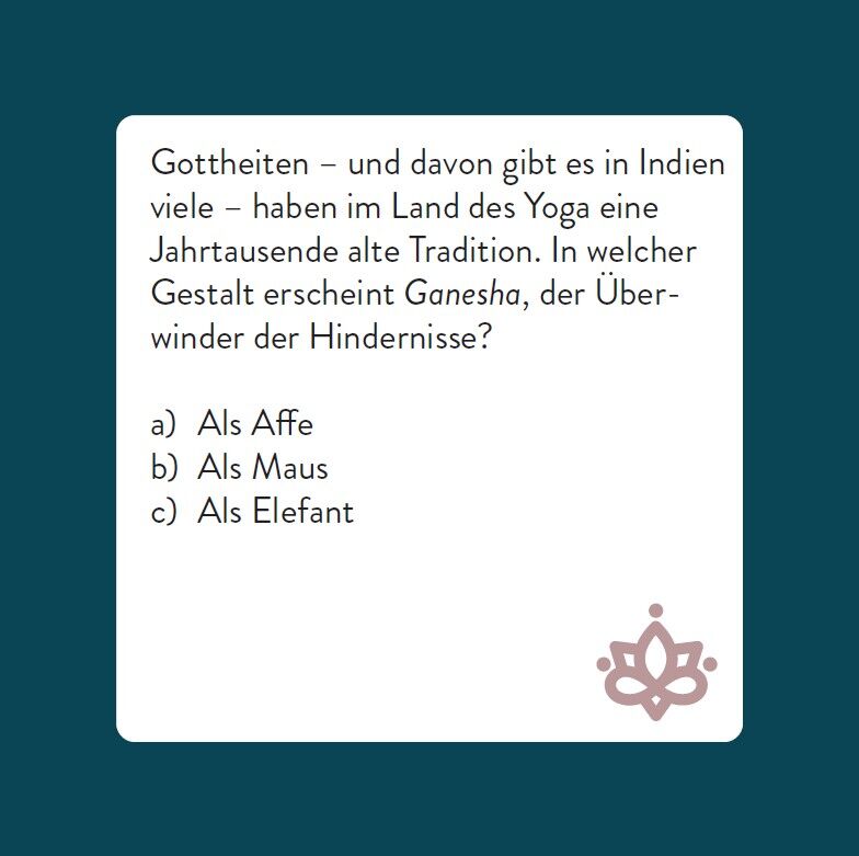 Mit dem Yoga-Quiz bringst du Körper und Geist spielerisch in Einklang! Dieses Wissensquiz besteht aus 66 Spielkarten und bietet eine spannende Mischung aus Fragen und Antworten rund um das Thema Yoga, darunter klassische Asanas wie der Sonnengruß und der hera...