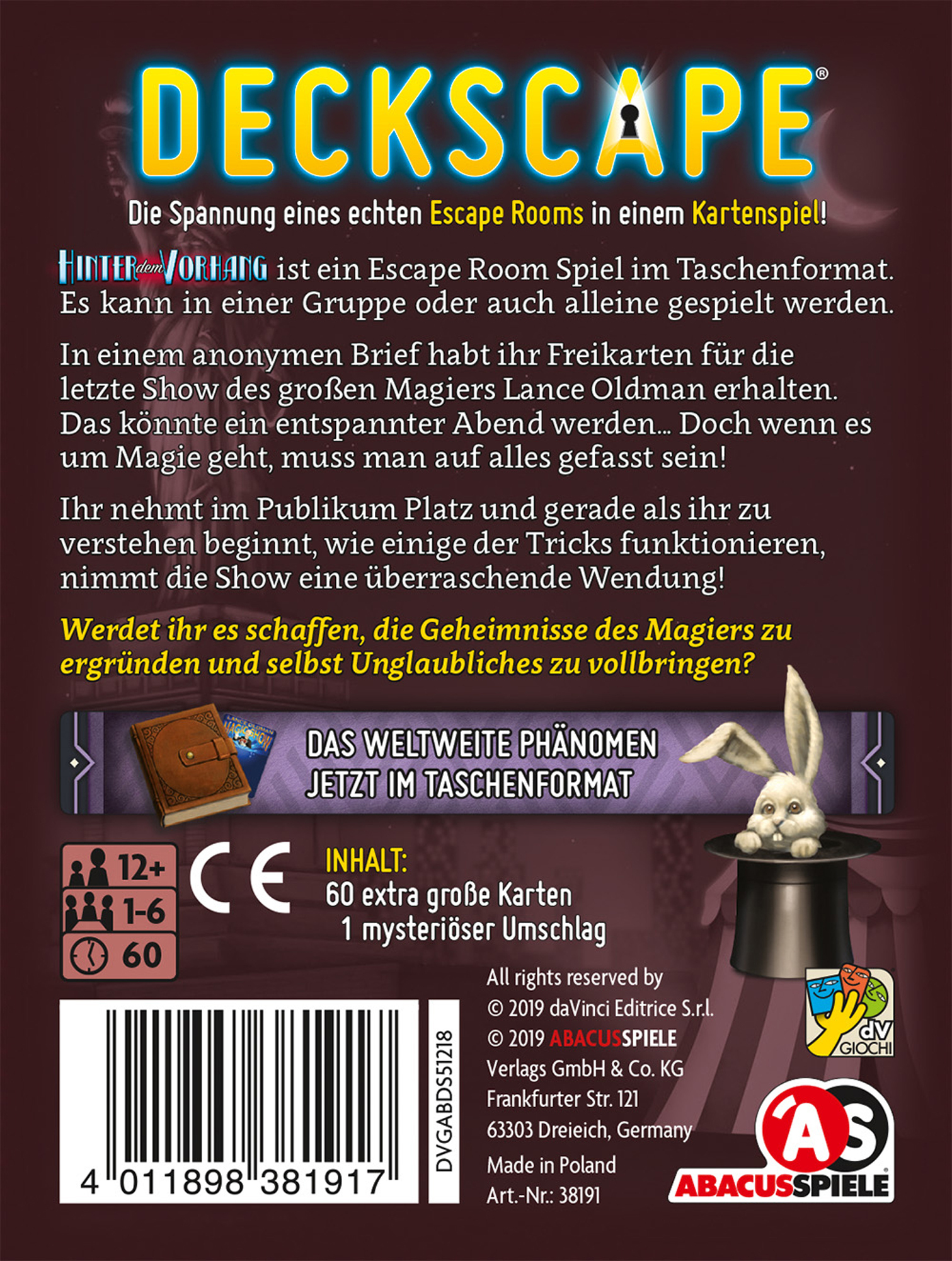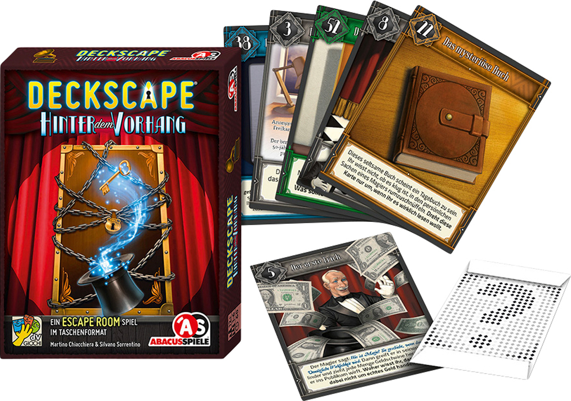 Deckscape - Hinter dem Vorhang Deckscape - Hinter dem Vorhang ist ein Escape Room Spiel im Taschenformat. Es kann in einer Gruppe oder auch alleine gespielt werden. In einem anonymen Brief habt ihr Freikarten fu¨r die letzte Show des großen Magiers Lance Oldma...