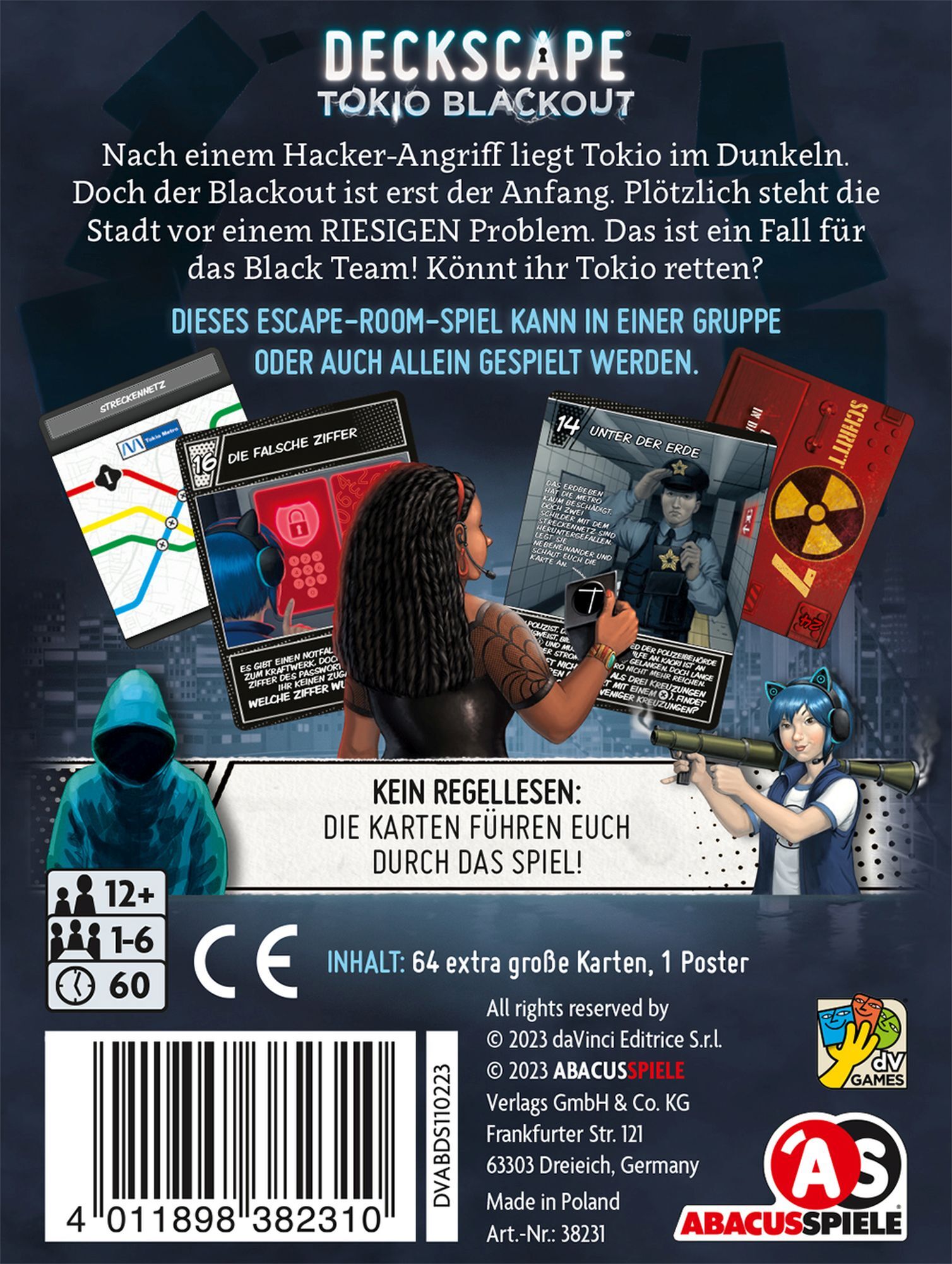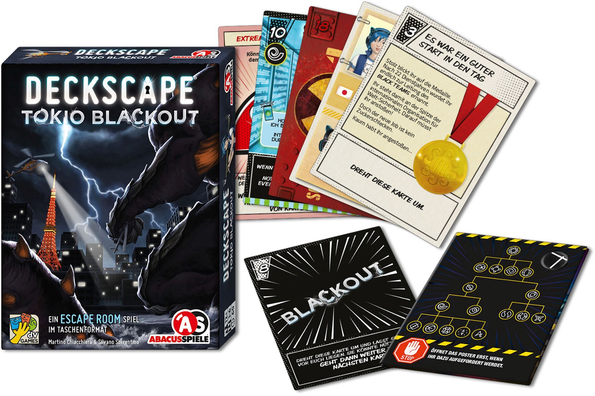 Deckscape: Tokio Blackout Deckscape - Tokio Blackout ist ein Escape Room Spiel im Taschenformat. Es kann mit einer Gruppe von Freunden oder auch allein gespielt werden. Nach einem Hacker-Angriff liegt Tokio im Dunkeln. Doch der Blackout ist erst der Anfang. Pl...