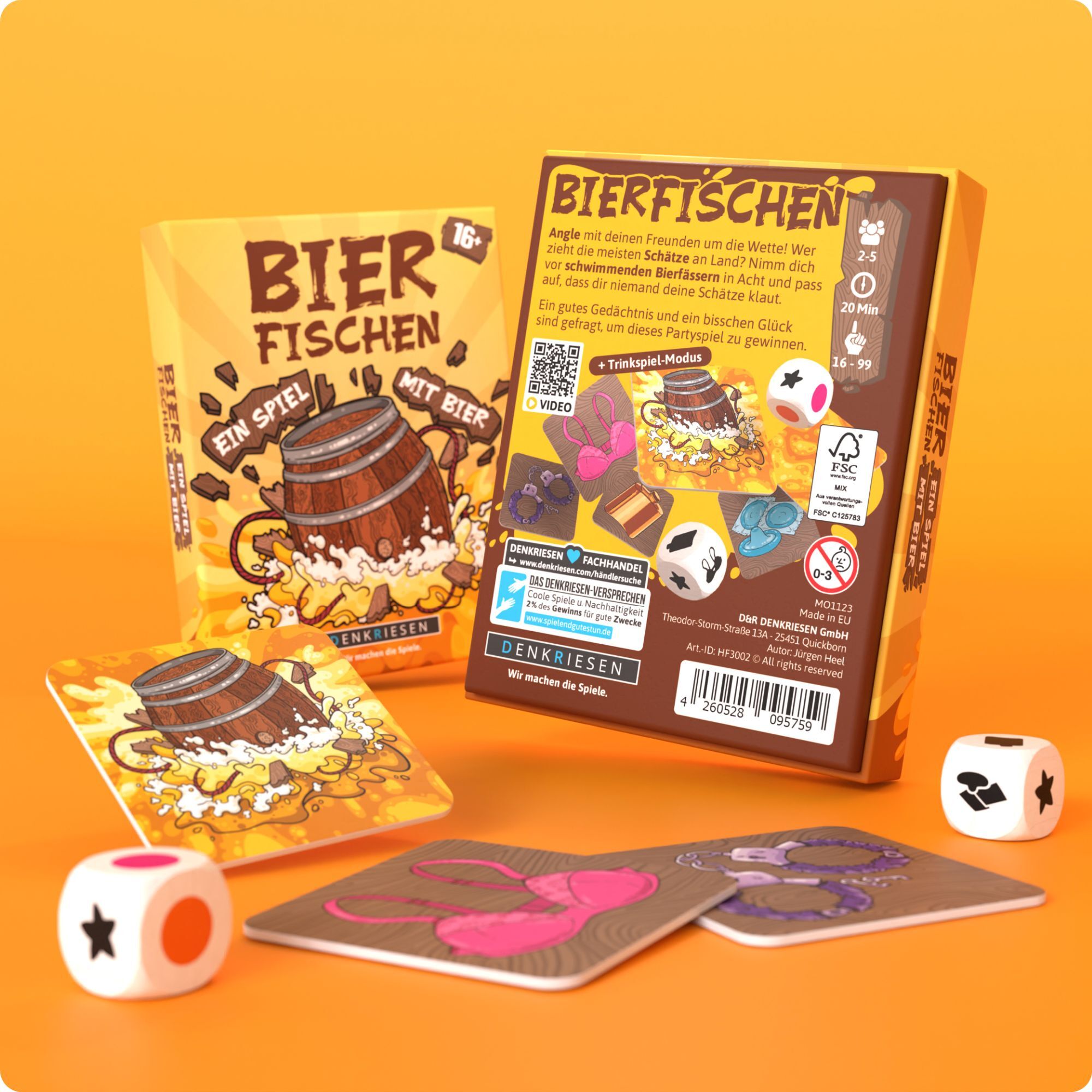 DENKRIESEN - Bierfischen - Ein Spiel mit Bier Angel mit deinen Freunden um die Wette! Wer zieht die meisten Schätze an Land? Nimm dich vor schwimmenden Bierfässern in acht und pass auf, dass dir niemand deine Schätze klaut. Ein gutes Gedächtnis und ein bissche...